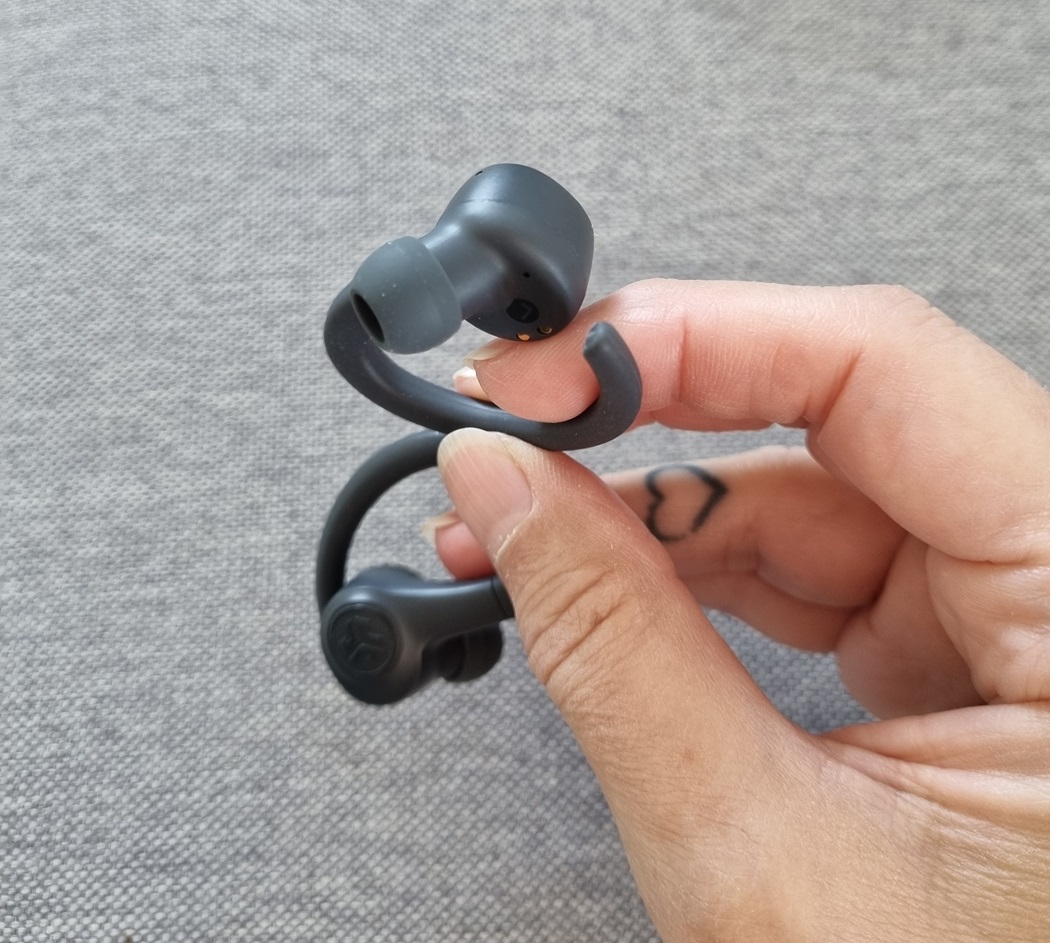 Kuulokenapit ovat melko pienet, mistä korvani pitävät. Korvakoukut pitävät napit jämäkästi paikoillaan niin villisti tanssiessani kuin joogatessani.