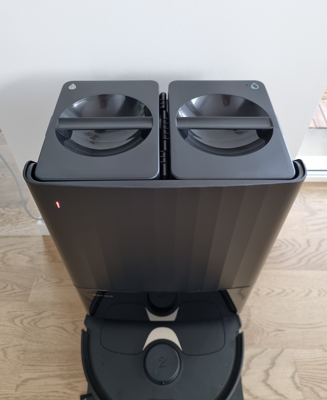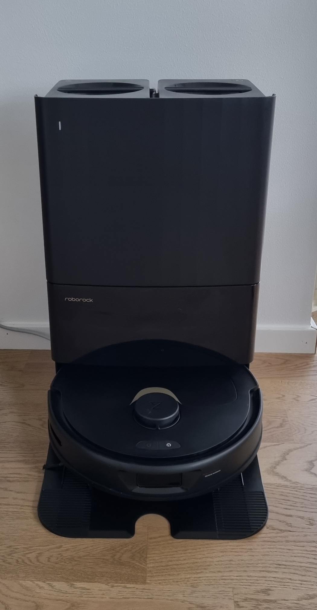 Latausasema on testin suurin, mutta siinä onkin kaksi vesisäiliötä, toinen puhtaalle ja toinen likaiselle. Ainoa pakkauksessa tuleva lisävaruste on ylimääräinen pölypussi – varustelu on siis melko niukkaa. Kun olen saanut robotin ja latausaseman paikoilleen, lataan Roborockin sovelluksen ja lisään sinne uuden ystäväni, jonka nimeän Roopeksi.