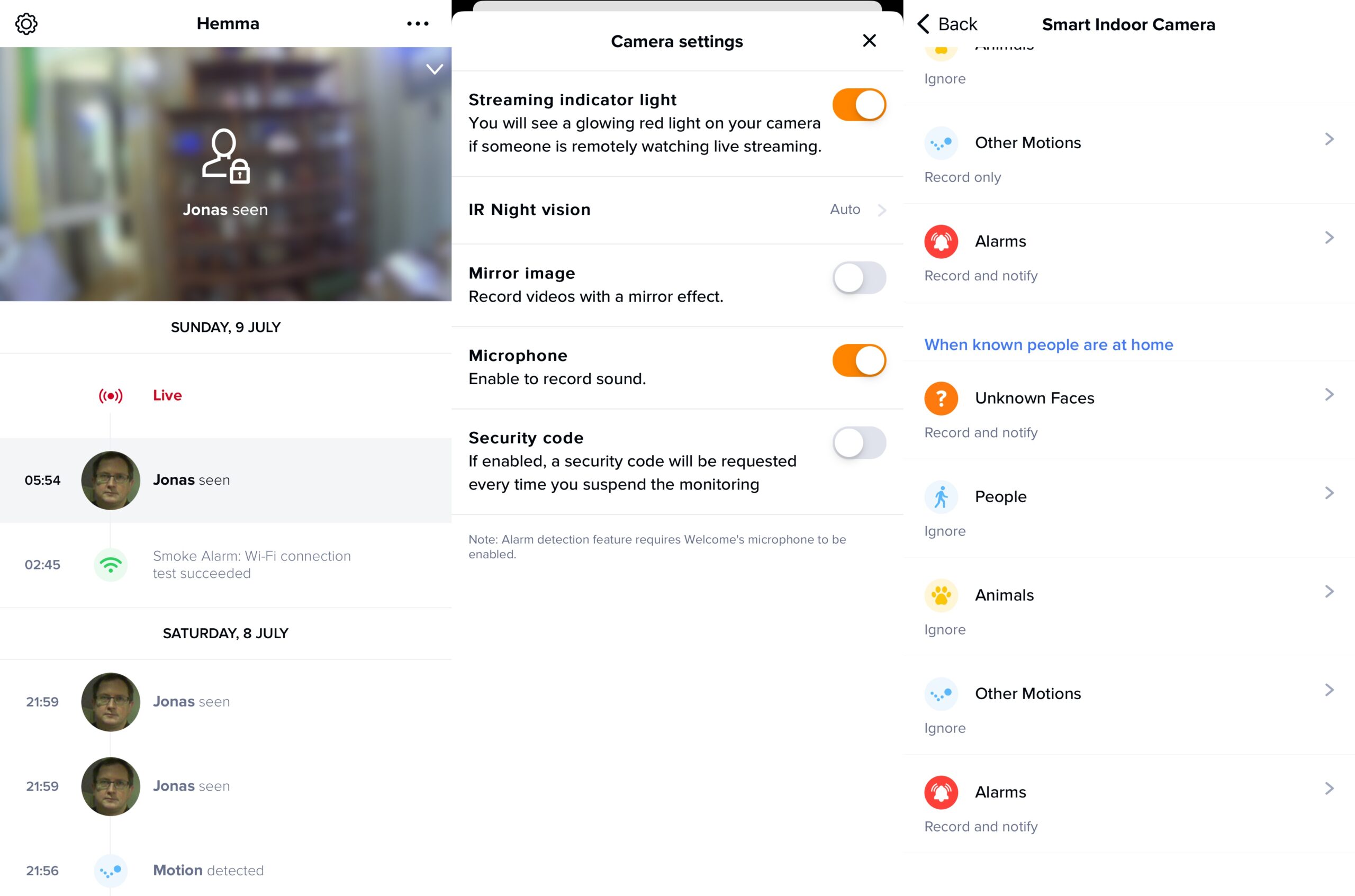 Netatmon hälyttimiä ja palovaroittimia hallinnoiva Security-sovellus näyttää kamerasta vain live-kuvaa ja tiedon siitä, mitä ihmisiä, liikkeitä tai tuntemattomia henkilöitä se on havainnut. Tallennetut videot on katsottava eri paikasta.