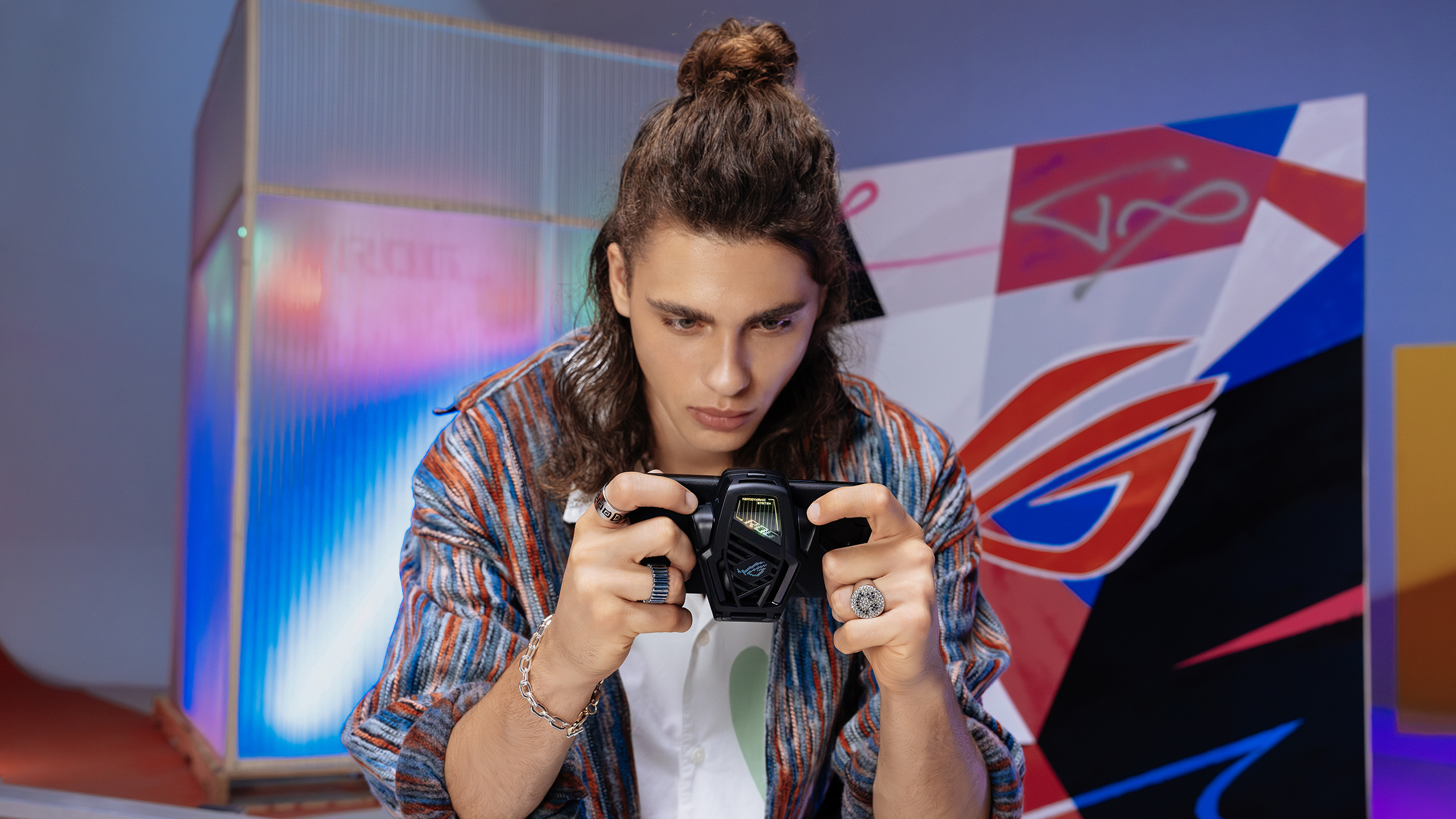 Muotoilultaan ROG Phone 8 eroaa edeltäjistään. Muotoilu ei nimittäin erotu enää joukosta. Poissa ovat scifi-värit, RGB-valot ja takanäyttö. Vain Anime Vision eli 341 ledin matriisinäyttö paljastaa, mitä puhelimen sisälle kätkeytyy. Mutta kun puhelinta pitää kädessä, se näyttää samalta kuin kaikki muutkin highend-mallit.