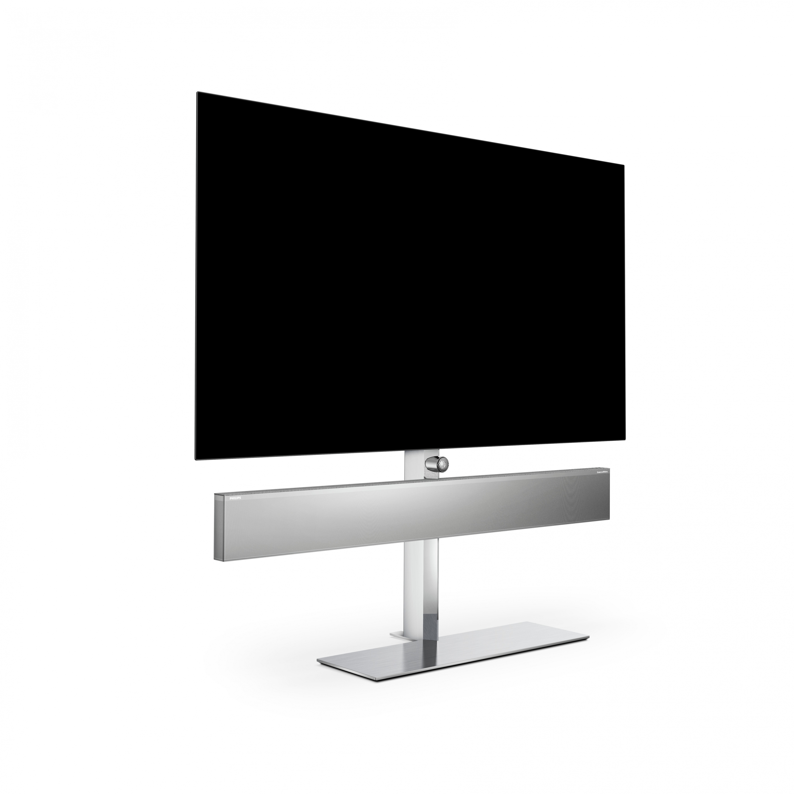 Philipin kallein televisiomalli seisoo vankan, kromi ja harjattua terästä yhdistelevän metallijalustan varassa. Ruudun alareunassa komeilee Bowers & Wilkinsin ylellinen soundbar. Televisiopuolella vastaavia kaiutinratkaisuja näkee harvoin – on mentävä B&O:n tasolle nähdäkseen mitään samansuuntaista.