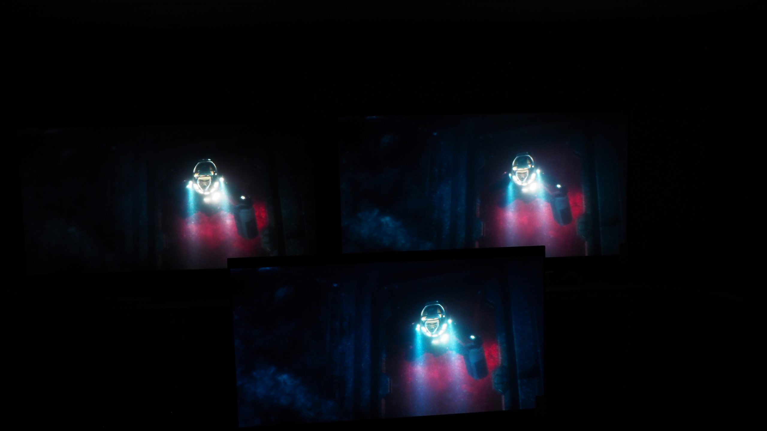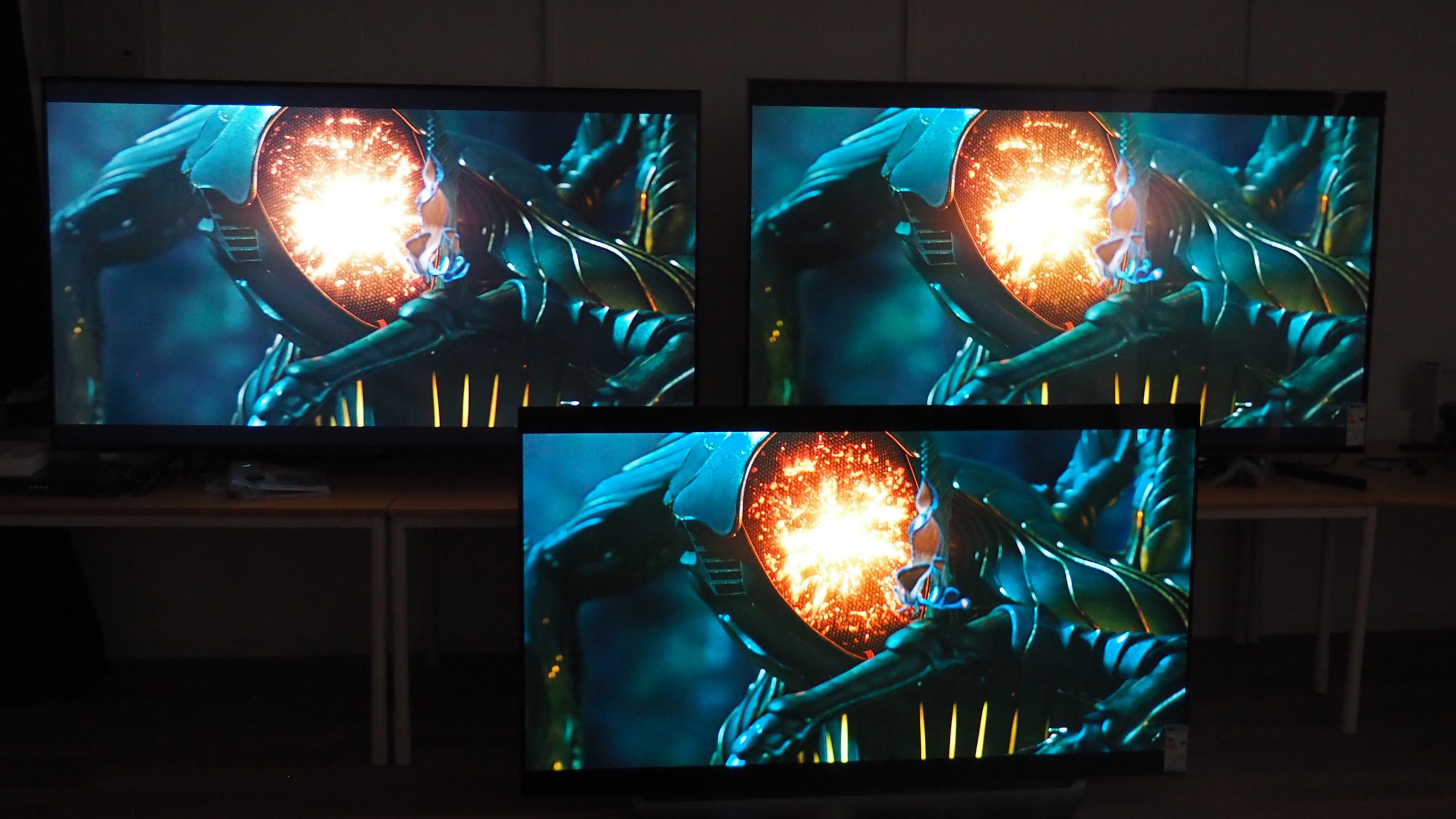 Sony X95:ssä (ylhäällä oikealla) on paljon vähemmän ylihimmennystä kuin Samsung Q70R:ssä (ylhäällä vasemmalla). LG:n C9 OLED (alimpana) on yhä paras himmennyksen suhteen, mutta tässä kuvassa sitä ei havaitse. Kuva: Geir Gråbein Nordby