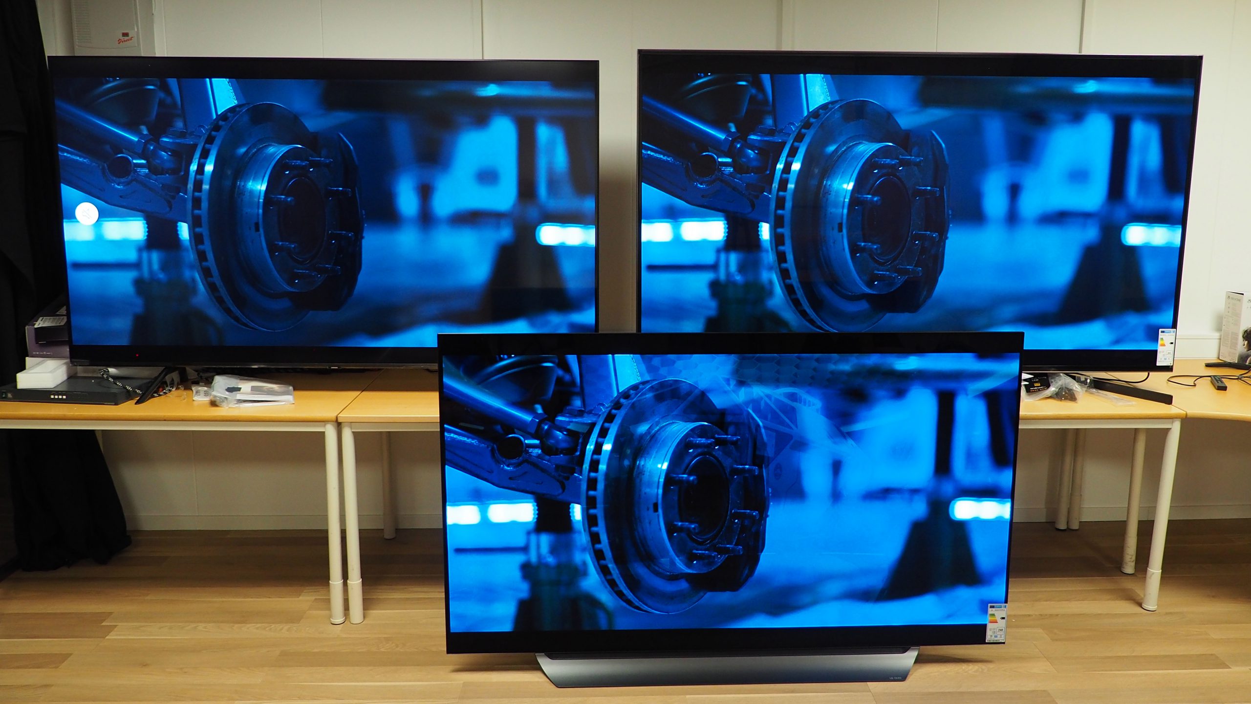 Sony XH95 (ylhäällä oikealla) on huomattavasti kirkkaampi kuin Samsung Q70R (ylhäällä vasemmalla) ja LG C9 (alimpana). LG:llä on enemmän painetta mustassa. Kuva: Geir Gråbein Nordby