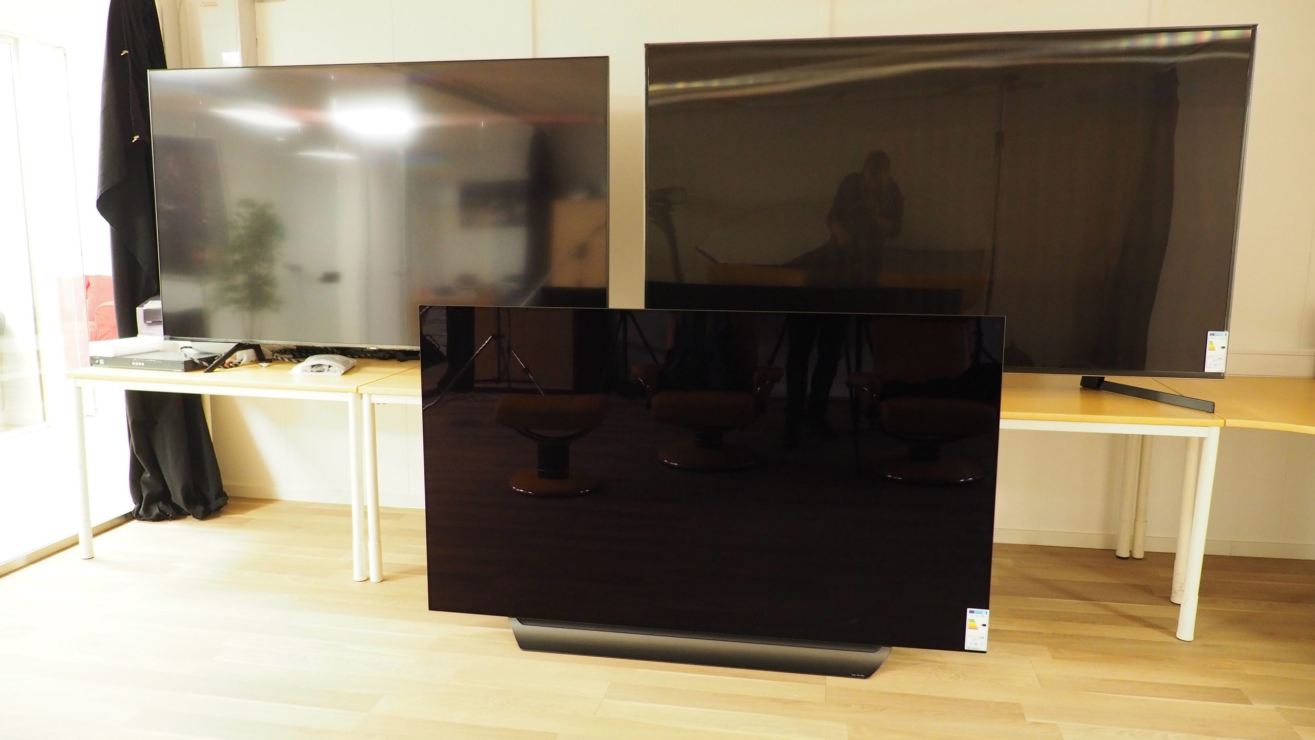 Sony XH95 (ylhäällä oikealla) heijastaa huonetta vähemmän kuin Samsung Q70R (ylhäällä vasemmalla. Kuvakulma tässä kuvassa ei ole ihan kohdillaan, sillä LG C9 (alimpana), joka on Samsungia parempi mutta Sonya heikompi, vaikka kuvasta voisi toisin päätellä. Kuva: Geir Gråbein Nordby