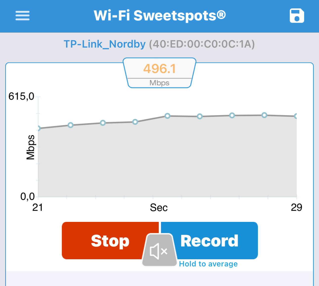 Yhteys on vakaa ja nopea, vaikkakaan ei nopeinta kärkeä. Kuvakaappaus: Wi-Fi Sweetspots (iOS)