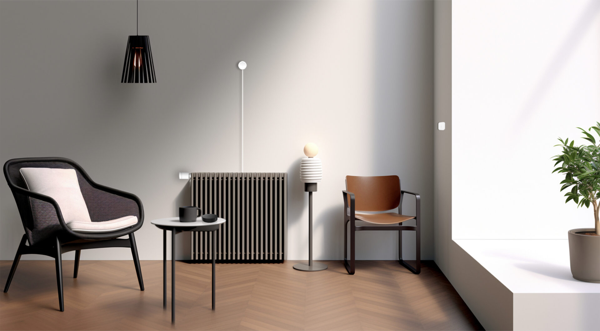 E1-patteritermostaatti ja T1-lämpö- ja ilmankosteusmittari tekevät yhteistyötä säätääkseen huoneen lämmön tasaiseksi. Termostaatti seuraa käyttäjän päivärytmiä: huoneen ollessa tyhjänä termostaatti säätää lämmityksen pienemmälle, mutta siellä oleskellessa tila on miellyttävän lämmin. Geofencing-toiminnon ansiosta lämmitys säätyy kovemmalle käyttäjän lähestyessä kotia, vaikka kotiin tultaisi ohjelmoidusta aikataulusta poikkeavasti. Tietysti järjestelmää voi ohjata itsekin puhelimella, puheohjauksella tai manuaalisesti termostaatin digitaaliselta näytöltä.