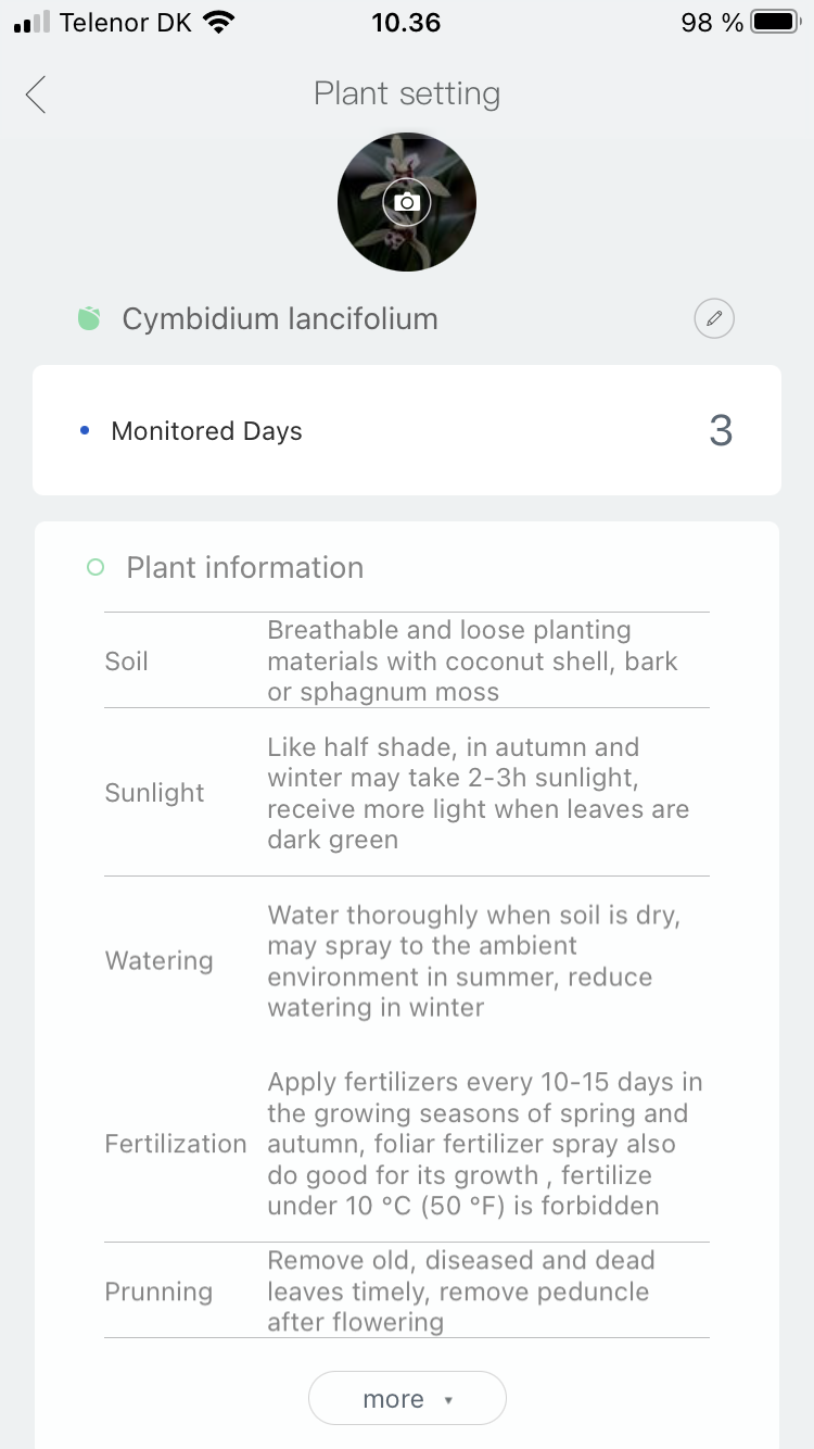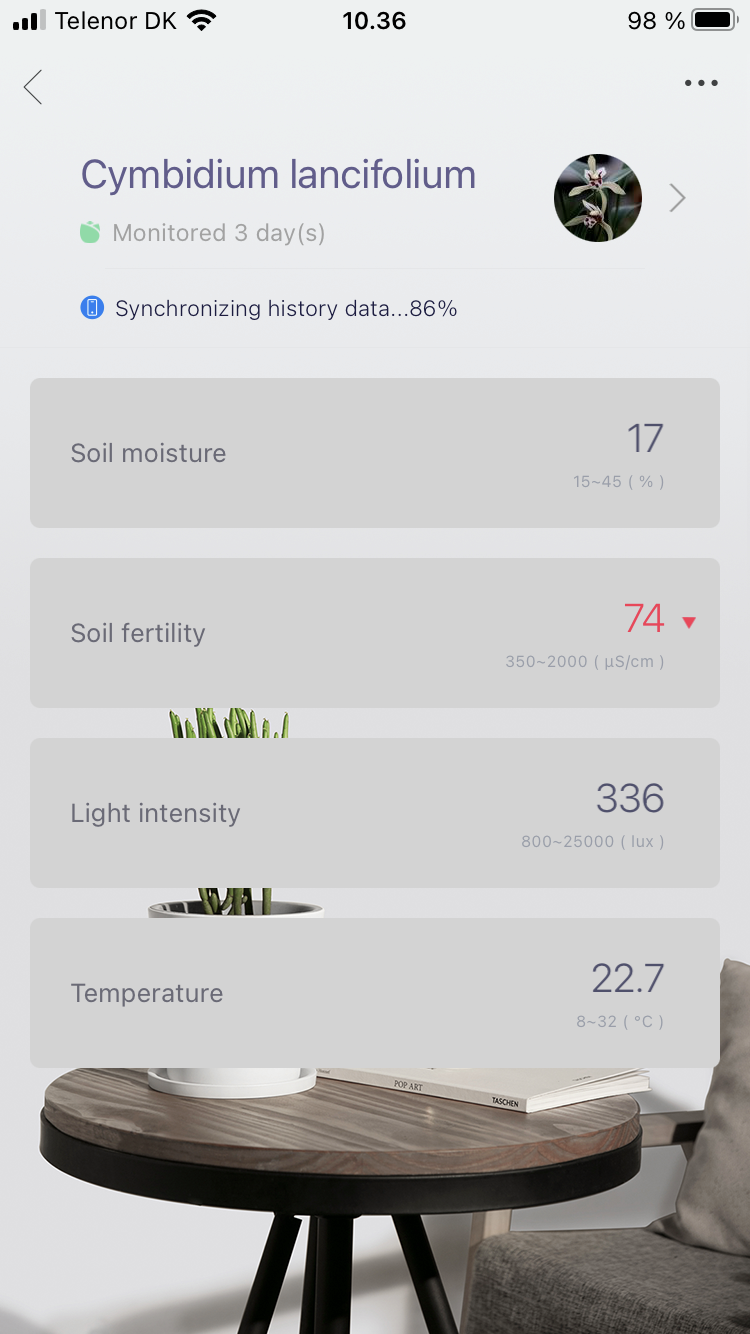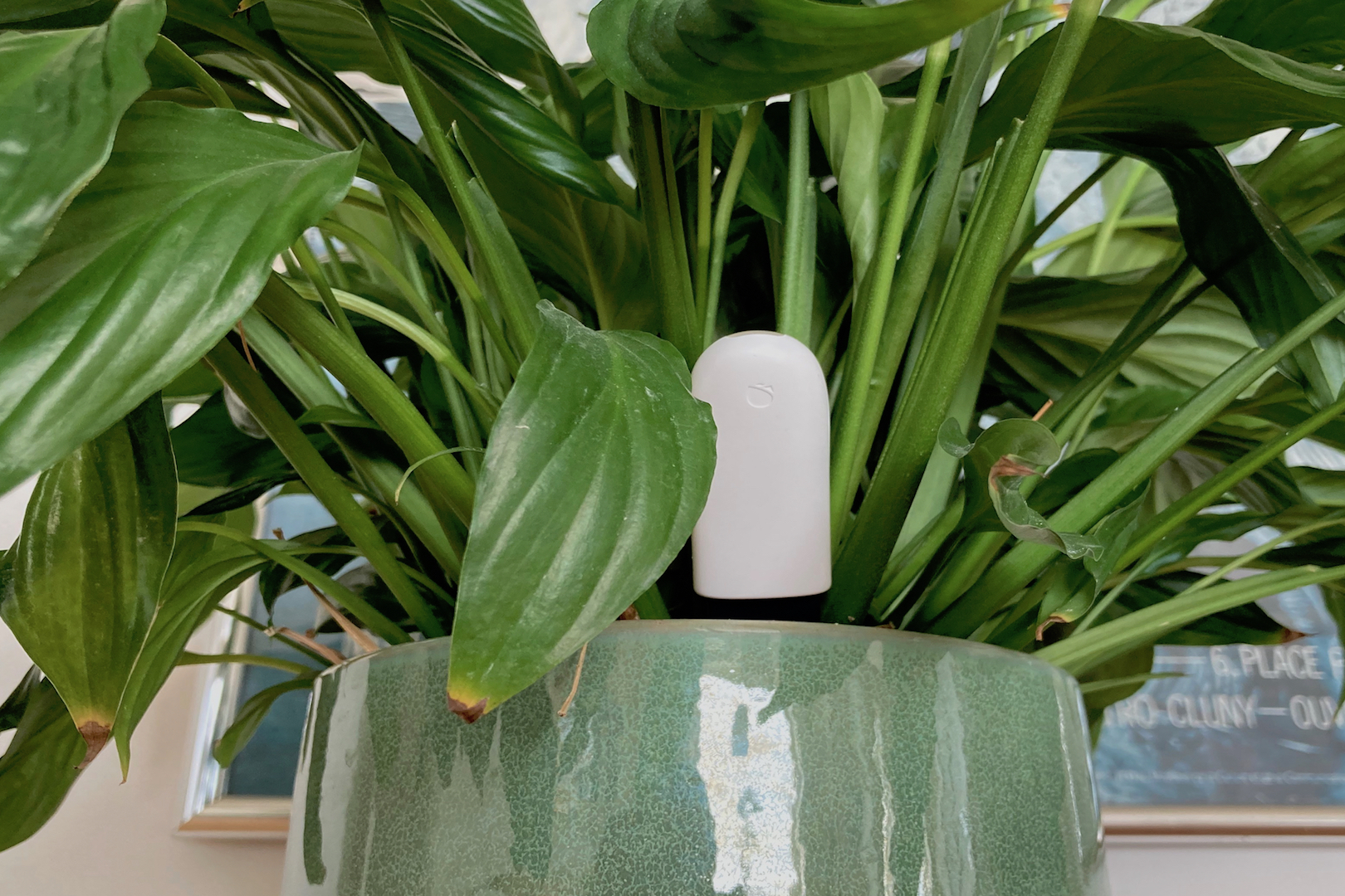 Flower Care on Bluetoothilla toimiva pitkäjalkainen sensori, joka tökätään multaan. Ilmainen Android- tai iOS-sovellus kertoo, millaista hoitoa mikäkin kasvi kaipaa. Kun sensorin on rekisteröinyt sovellukseen, oma kasvi etsitään 5 000 lajin joukosta. Jos ei tiedä, minkäniminen kasvi ruukussa sattuu kasvamaan, sen voi etsiä sovelluksella värin, muodon ja lehtien perusteella. Näin sain tietää, että ruokahuoneen valkokukkainen komistus on nimeltään Spathiphyllum kochii.