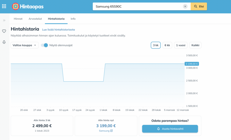 Alennusmyyntien aikaan onkin aina hyvä tarkistaa Hintaopas.fi-sivuston kaltaiset hintaseurantasivut, jotka näyttävät tuotteen hinnan eri jälleenmyyjillä mutta myös sen, miten hinta on vaihdellut viime kuukausien aikana.