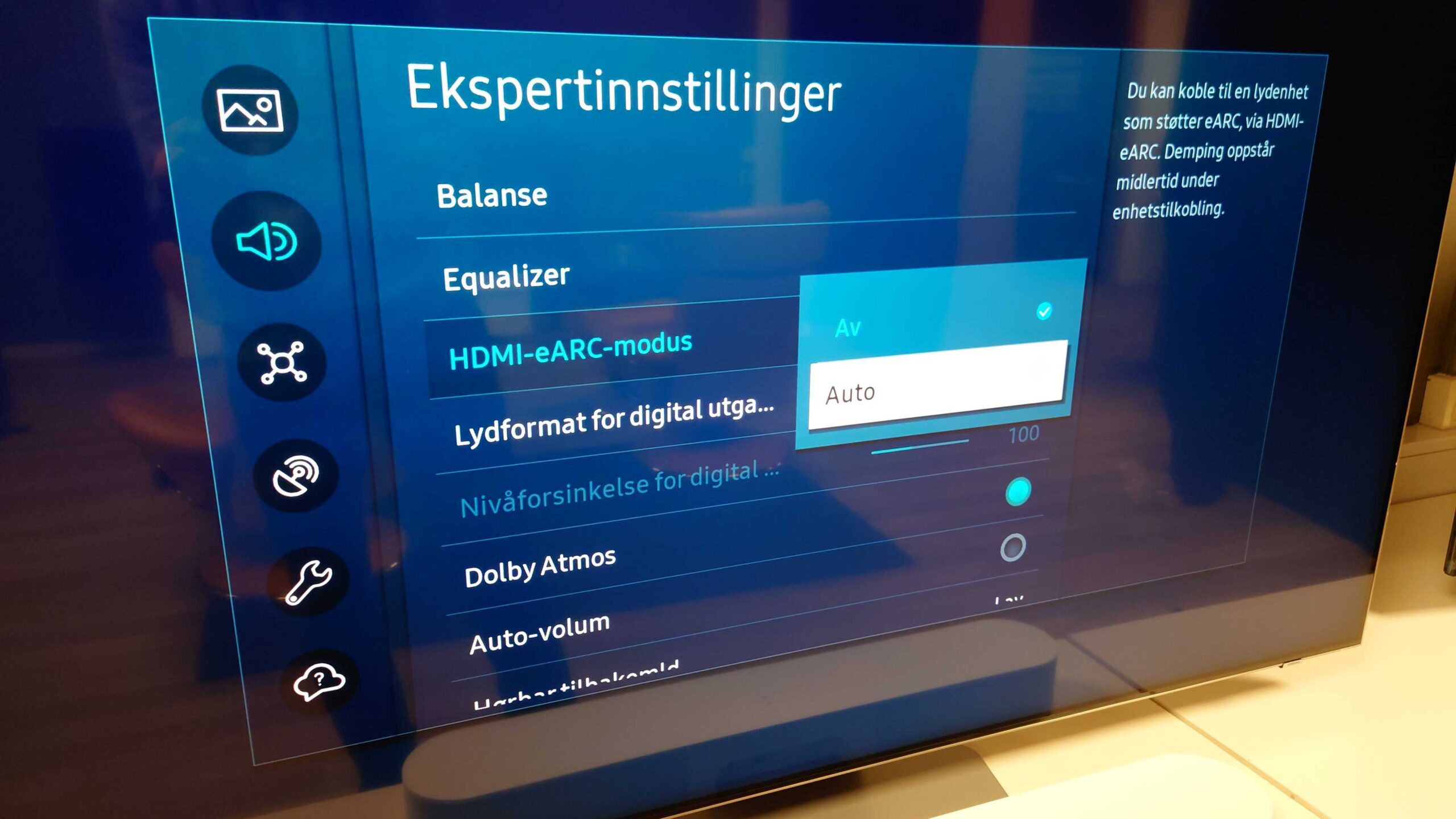 Jos on yhdistänyt kaiuttimen HDMI ARC:n kautta, voi olla tarpeen muuttaa television ääniasetuksia. Jos asetuksista löytyy HDMI ARC/eARC -kohta, se valitaan.