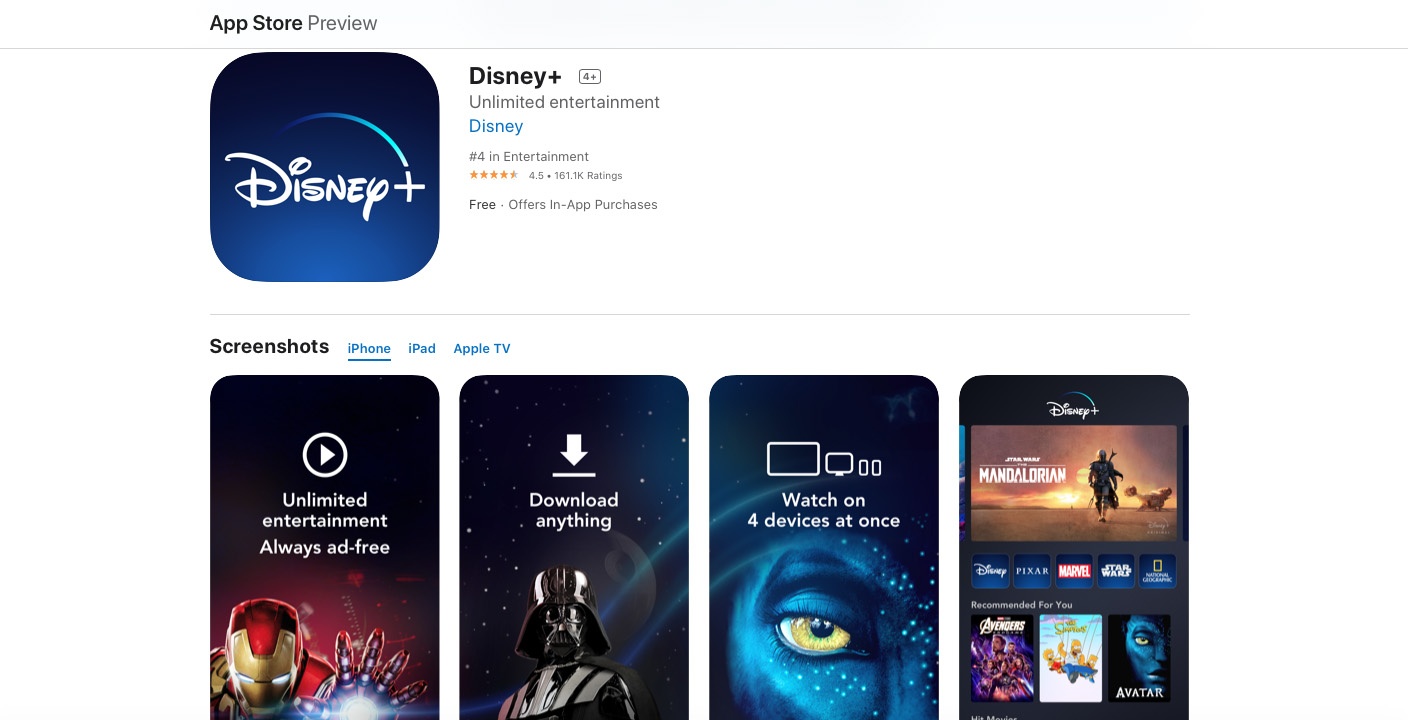 Applen iOS-kännykällä tai -tabletilla tai Apple TV:llä sovellus ladataan App Storesta: https://apps.apple.com/us/app/disney/id1446075923