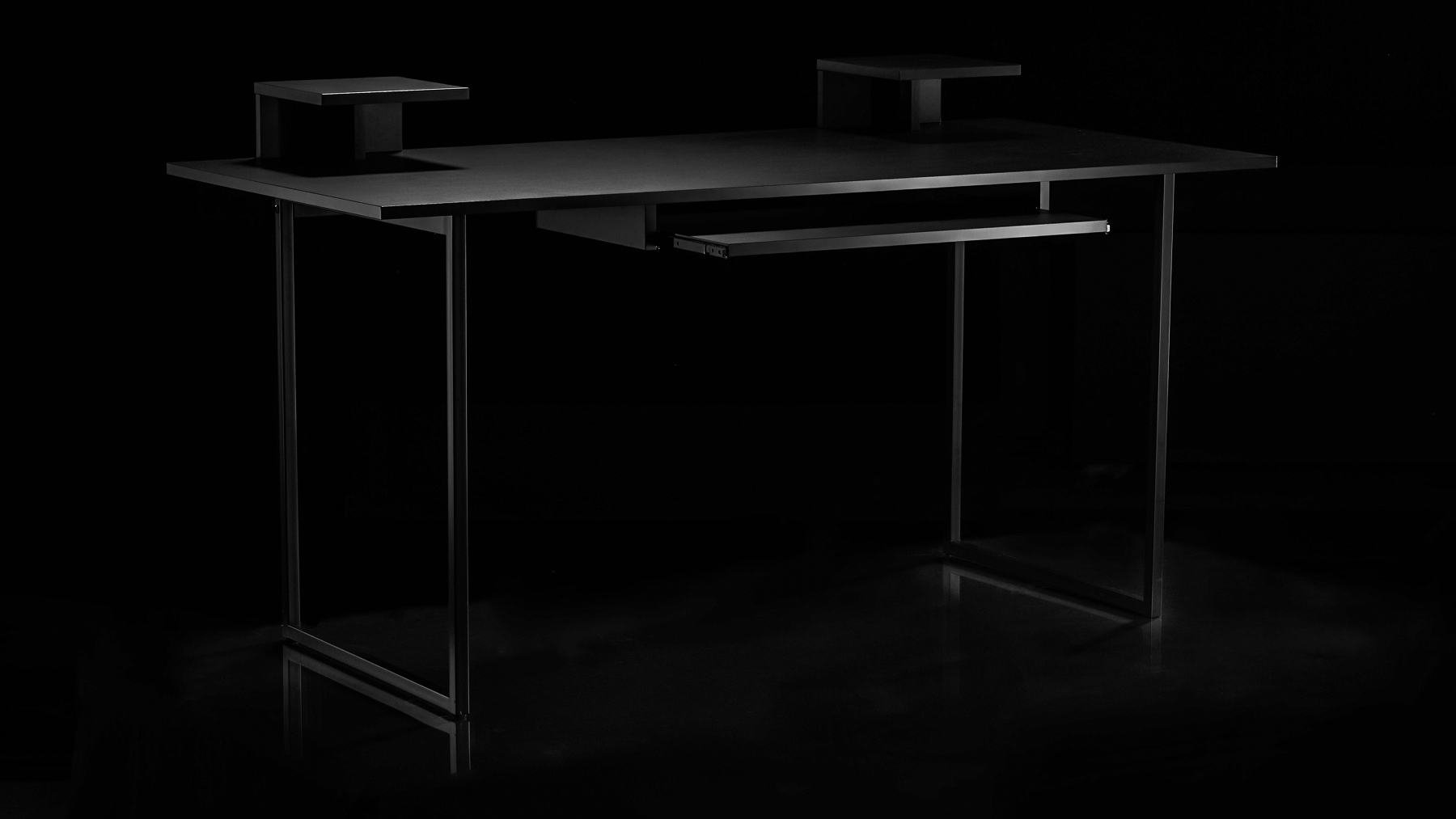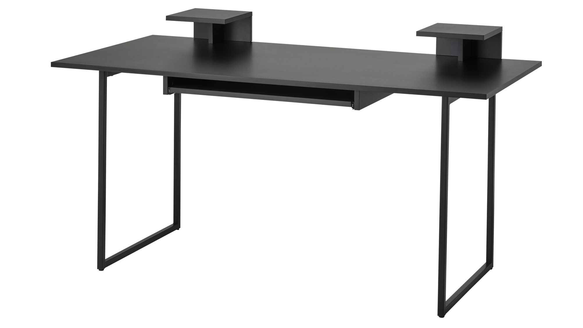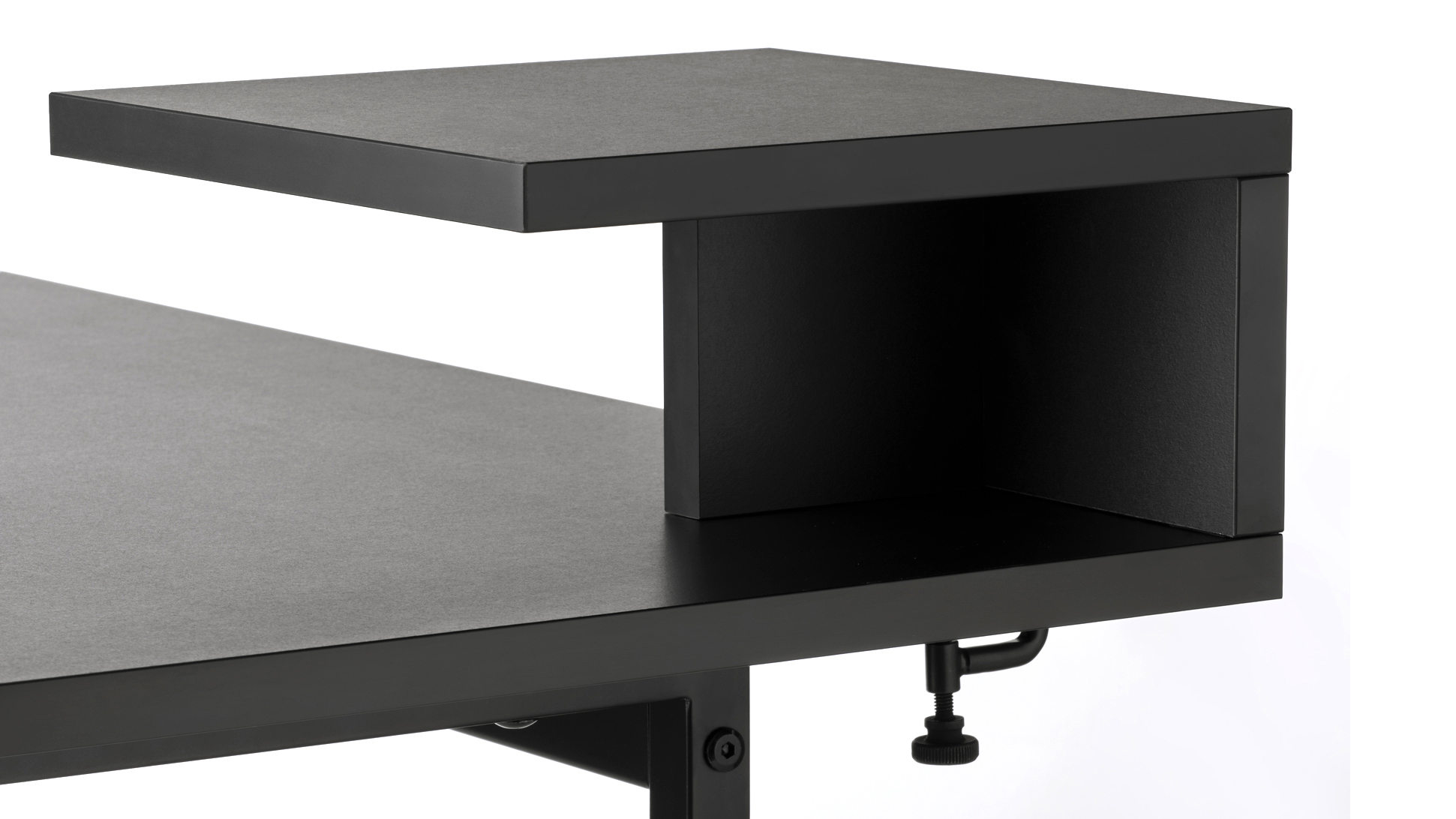 Pöytä on varustettu myös kahdella hyllyllä, joille saa studiomonitorit. Niiden etäisyys on säädettävissä, joten niiden väliin saa vielä haluamansa kokoisen näytön.