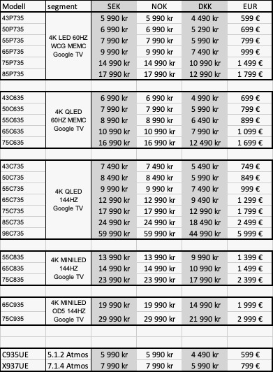TCL:n uudet mallit ovat kaupoissa kevään ja kesän aikana. Alla olevasta kuvasta selviävät mallien eurohinnat: