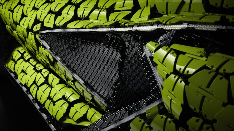”Täydellisesti mittasuhteessa olevassa mallissa on kuusikulmaisista Lego-palikoista tehty pintarakenne, joka on kiinnitetty runkoon. Muotoilu on kunnianosoitus Automobili Lamborghinin tunnetulle kuusikulmaiselle muotokielelle, joka toistuu ikonisissa takavaloissa ja pakoputkessa”, kerrotaan lehdistötiedotteessa.