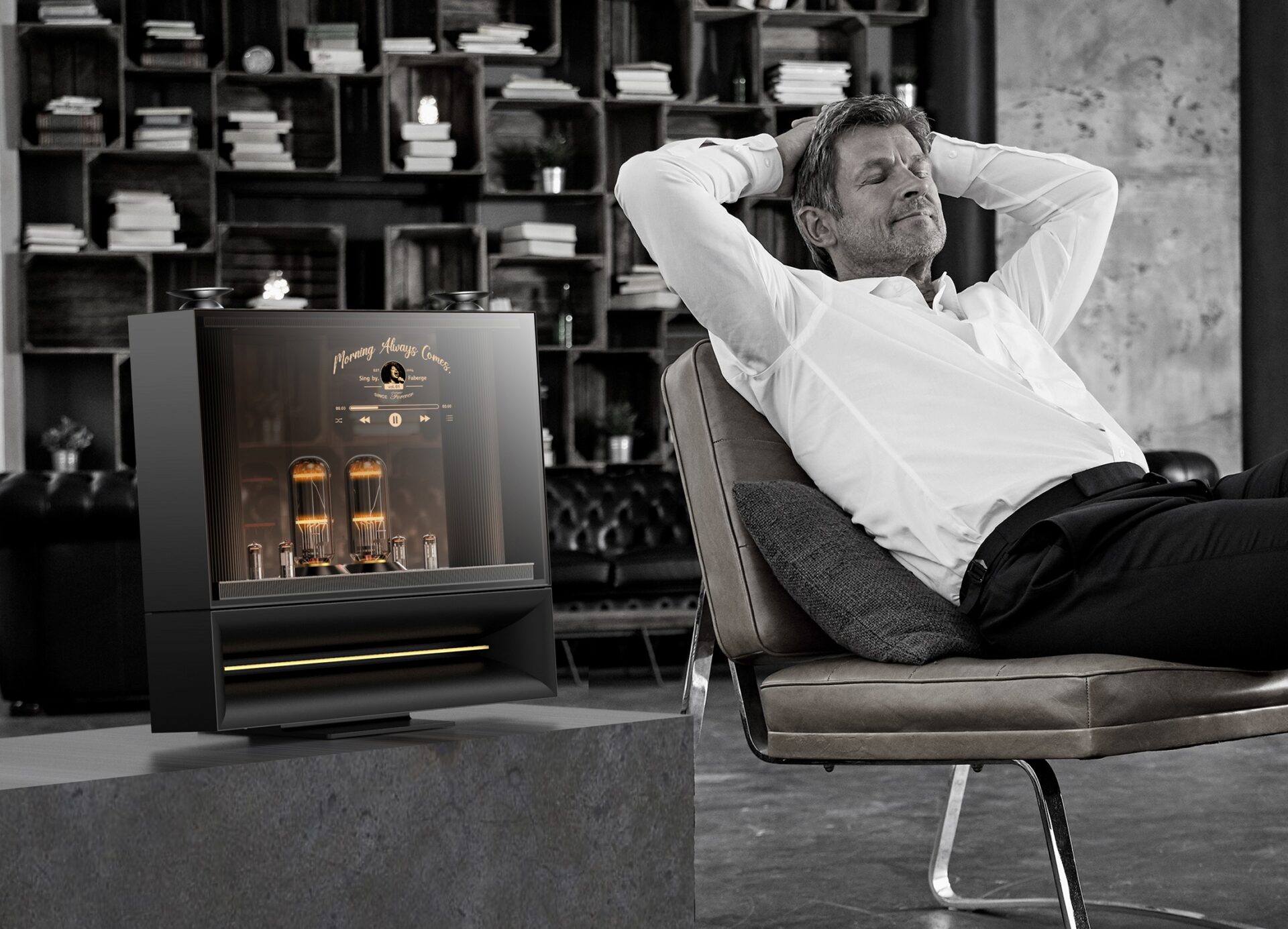 LG:n uutuuskaiutin on kuin moderni jukebox, joka yhdistää kuvan ja äänen saumattomasti. Laitteen pohjassa on kaksi eteenpäin suunnattua kaiutinta sekä yksi 360 asteen kaiutin päällä. Laatikon sisältö eli itse putkivahvistin on näkyvillä OLED-näytön takana. Kaiutin on LG Labsin kädenjälkeä eli eteläkorealaisfirman kokeellisemman osaston hengentuotos. LG Labsilla on CES-messuilla jopa aivan oma osastonsa.