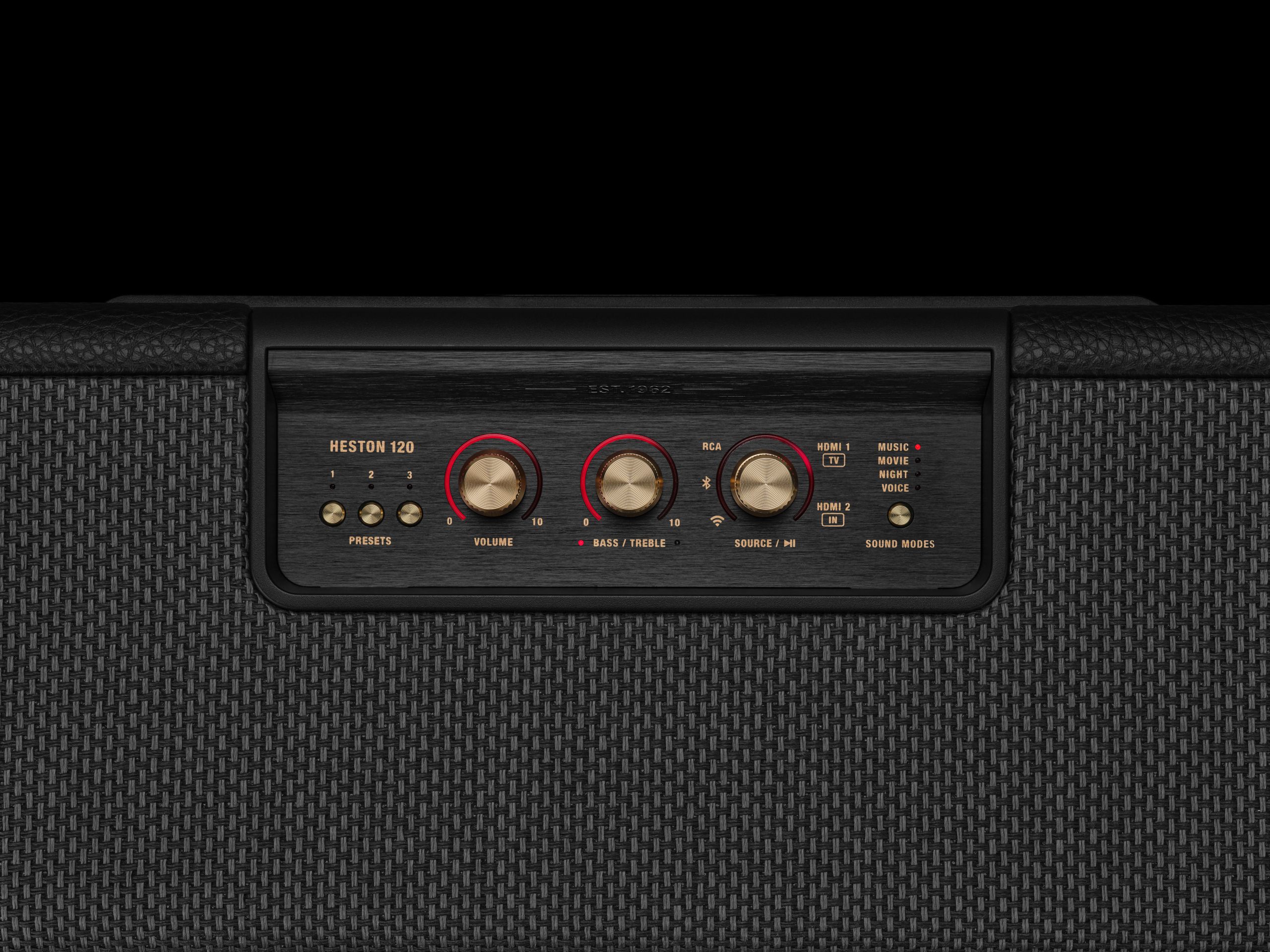 Heston 120 eroaa joukosta tunnistettavalla Marshall-designillaan: nahkamainen pinta, metalliverkot ja logo ovat tuttuja muistakin valmistajan tuotteista aina niistä vahvistimista lähtien. Soundbarin päällä on alumiiniset säätönupit volyyminsäätöön sekä basson ja diskantin hienosäätöön. Ne huokuvat vanhan ajan analogista tunnelmaa, mitä lisää sekin, että soundbarin analogiseen sisääntuloon saa kytkettyä levysoittimen.