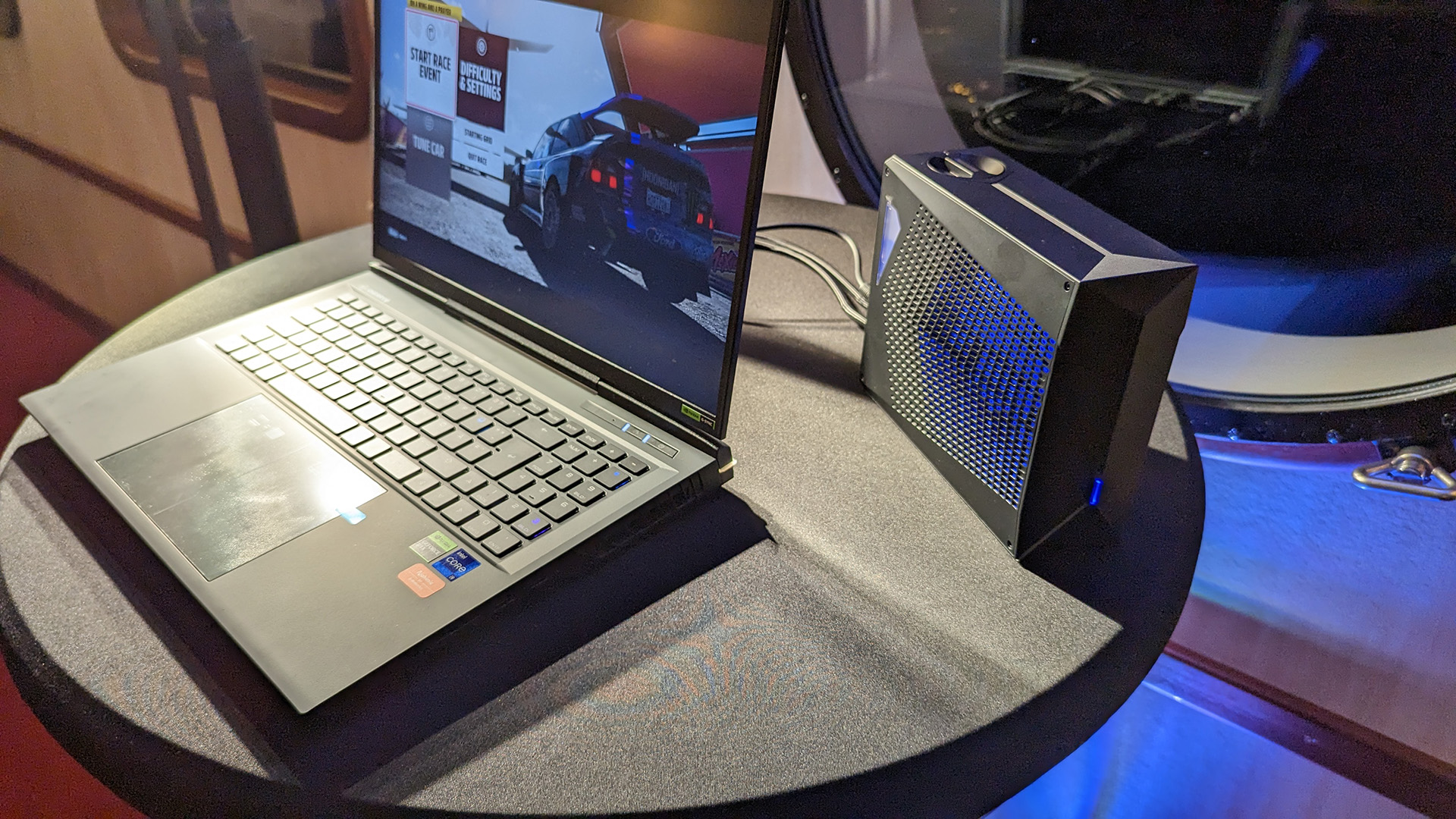Esittelykoneessa oli ”sivuvaunu”, johon oli sijoitettu tuulettimia ja RGB-valot. Se ei ole, kuten ensisilmäyksellä luulisi, ulkoinen grafiikkakiihdytin Asus ROG Flow X13 -kannettavan tapaan, vaan vesijäähdytin koneen viilennykseen!