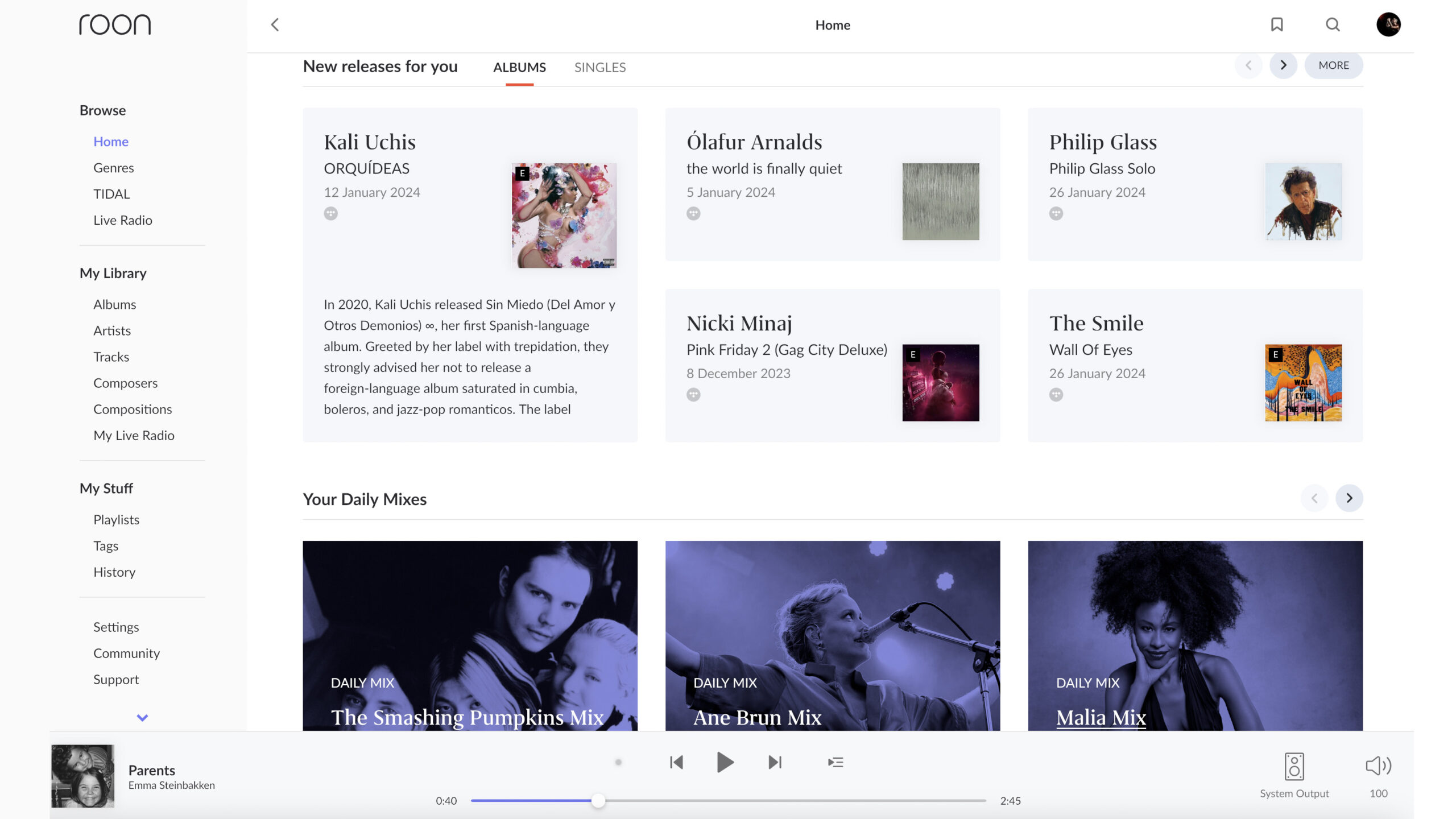 Mutta ensin: mikä on Roon? Roon on käyttöliittymä – tai ehkä oikeammin tietokoneohjelma – joka soittaa tallennettuja musiikkitiedostoja ja striimaa nettiradiota, Qobuzia ja Tidalia. Roon tarjoaa visuaalisesti ymmärrettävän yleisnäkymän, johon liittyy albumin kansikuvia, artistiesittelyjä ja räätälöityjä kuuntelusuosituksia. Kun ohjelman on avannut tietokoneella, voi sitä sen jälkeen halutessaan ohjata helposti puhelinsovelluksella.
