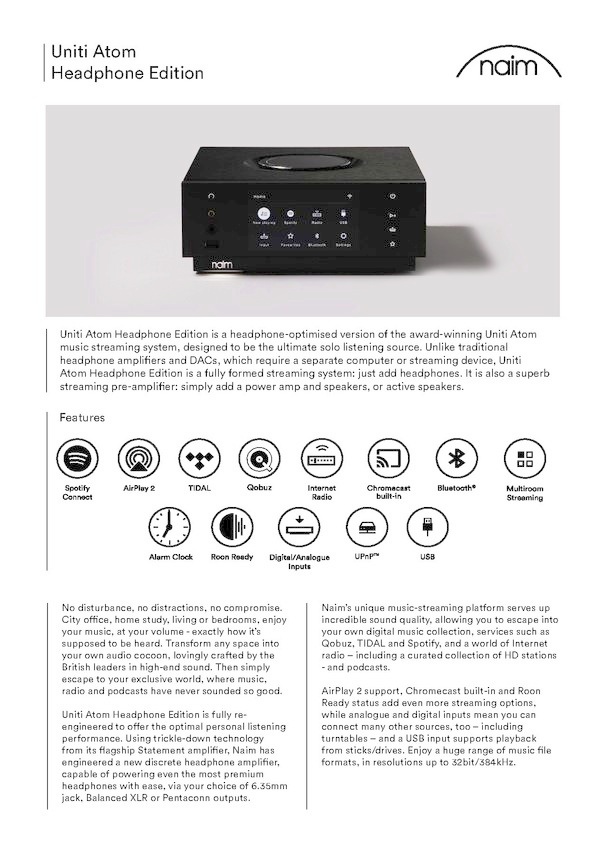 Alkueräinen Uniti Atom on tehosyöpöille kaiuttimille tarkoitettu vahvistin, mutta Headphone Edition -versio on nimensä mukaisesti puhdas kuulokevahvistin. Naim ei ole pihistellyt tämänkään laitteen valmistamisessa: Headphone Edition hyödyntää kuulemma arvokkaan Statement-vahvistimen tekniikkaa virtalähteessä ja sen pitäisi suoriutua ”kaikista” kuulokkeista – myös vaativasta Focal Utopiasta – vaivatta.