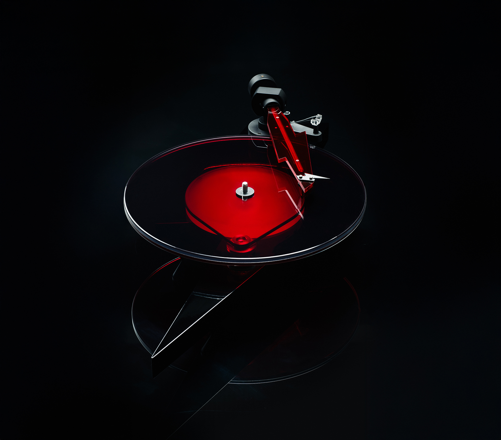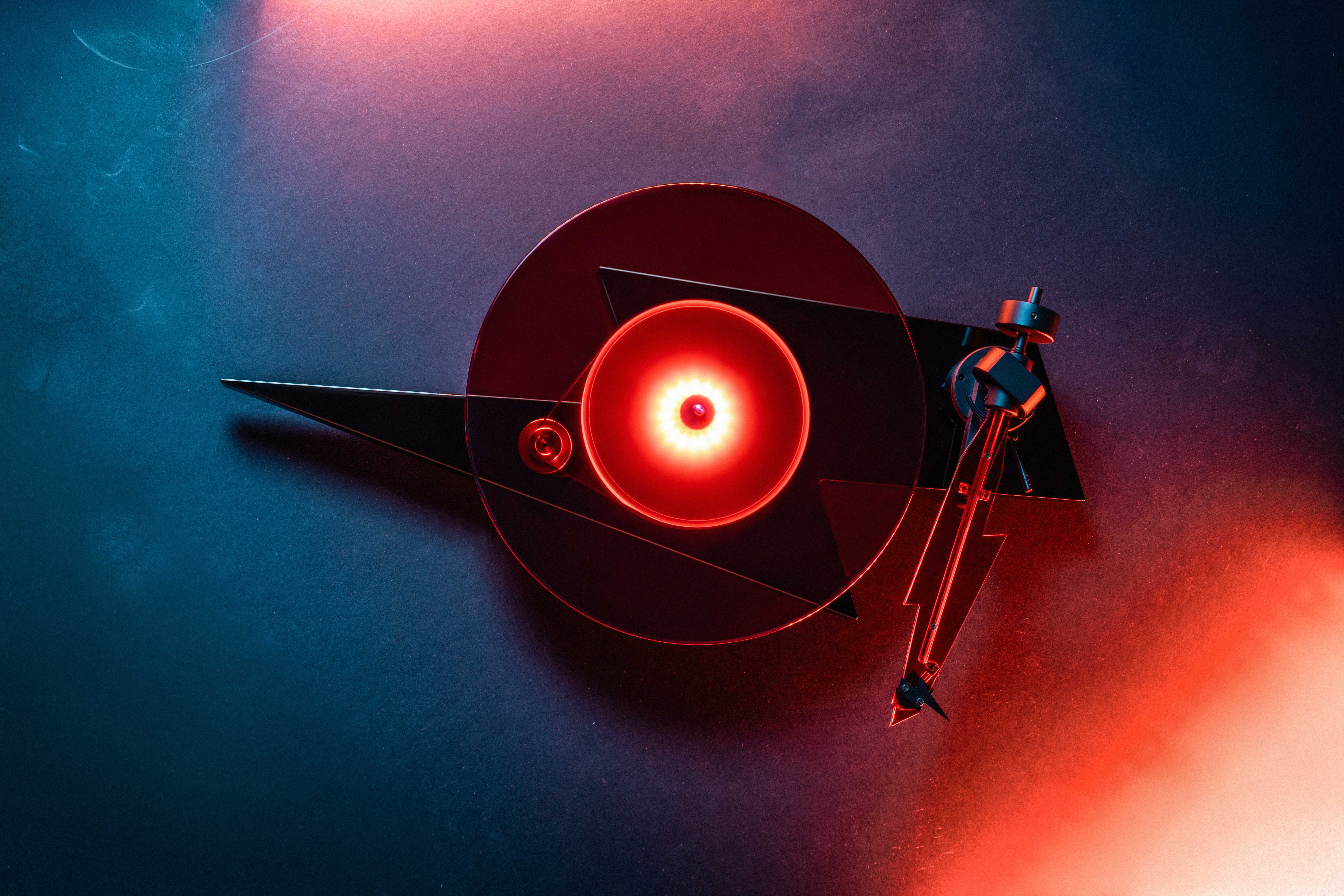 Soittimessa on klassinen hihnavetoinen moottori, joka pyörittää sisempää akryylilautasta ja sen päällä olevaa punaista lasilautasta. Levysoitin on valmistettu mustasta MDF:stä ja muotoiltu salamaksi, jonka toisessa kärjessä on 8,6-tuumainen äänivarsi – eikä sekään ole ihan tavallinen, vaan tehty läpinäkyvästä akryylista. Äänirasia on MM-tyypin Ortofon 2M Red, josta meillä on hyviä kokemuksia.