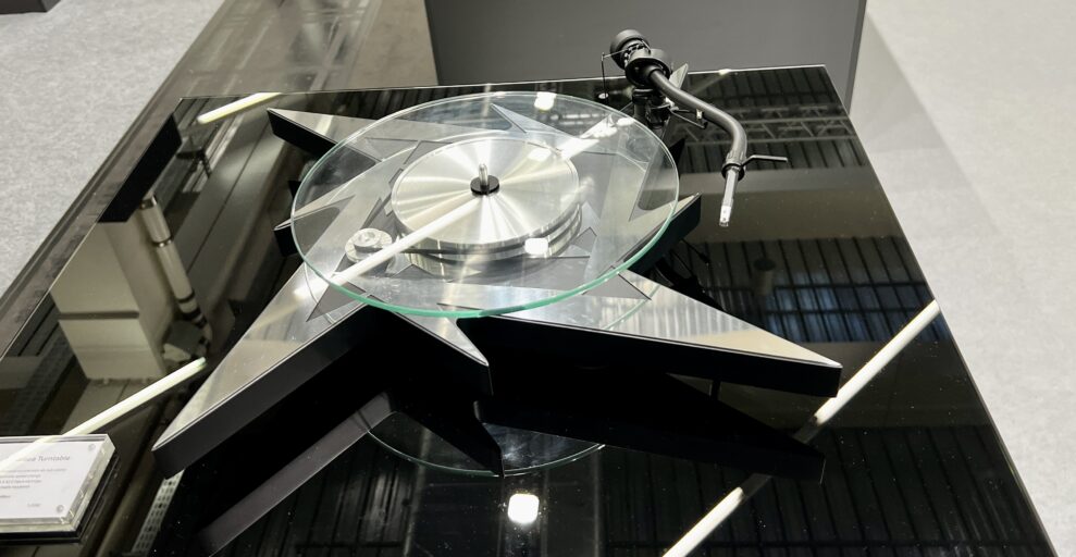 Toinen messuilla esitelty uutuus on nimeltään Signature 12.2. Se on vasta konseptiasteella, mutta Pjo-Jectin tuntien ei mene kauaakaan, niin tämäkin saadaan hifikauppoihin. Kuten kuvasta näkyy, on kyseessä hihnavetoinen levysoitin, jossa on selvästi aivan uusi äänivarsi – ainakaan emme ole moista ennen nähneet.
