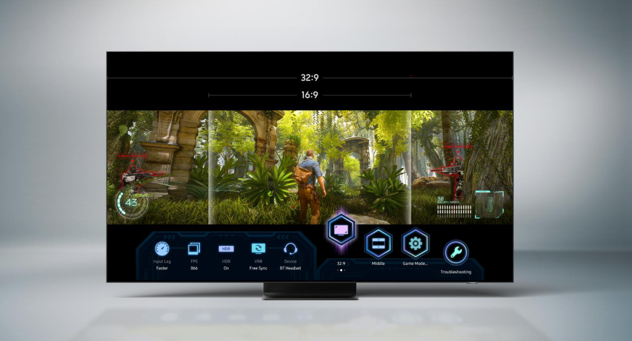 Television käyttäminen pelaamiseen, olipa välineenä sitten Xbox, PS5 tai PC, on yhä suositumpaa. Samsung onkin panostanut televisioidensa peliominaisuuksiin. Uusissa 2021-malleisas onkin peliystävällinen Game Bar -käyttöliittymä, josta näkee oleelliset asetukset ja pääsee optimoituihin pelitoimintoihin, kuten esimerkiksi Super Ultrawide Gameview’hun, jossa voi vaihtaa kuvasuhteen 21:9- tai 32:9-formaattiin. Näin saa laajemman näkymän peliin ja PC-pelaajatkin tuntevat olonsa kotoisemmaksi. Monessa 2021-mallissa on lisäksi AMD FreeSync Premium Pro, joka mahdollistaa alhaisen viiveen (jopa 5,8 millisekuntia) ja sulavan liikkeidentoiston ilman screen tearing -efektiä.