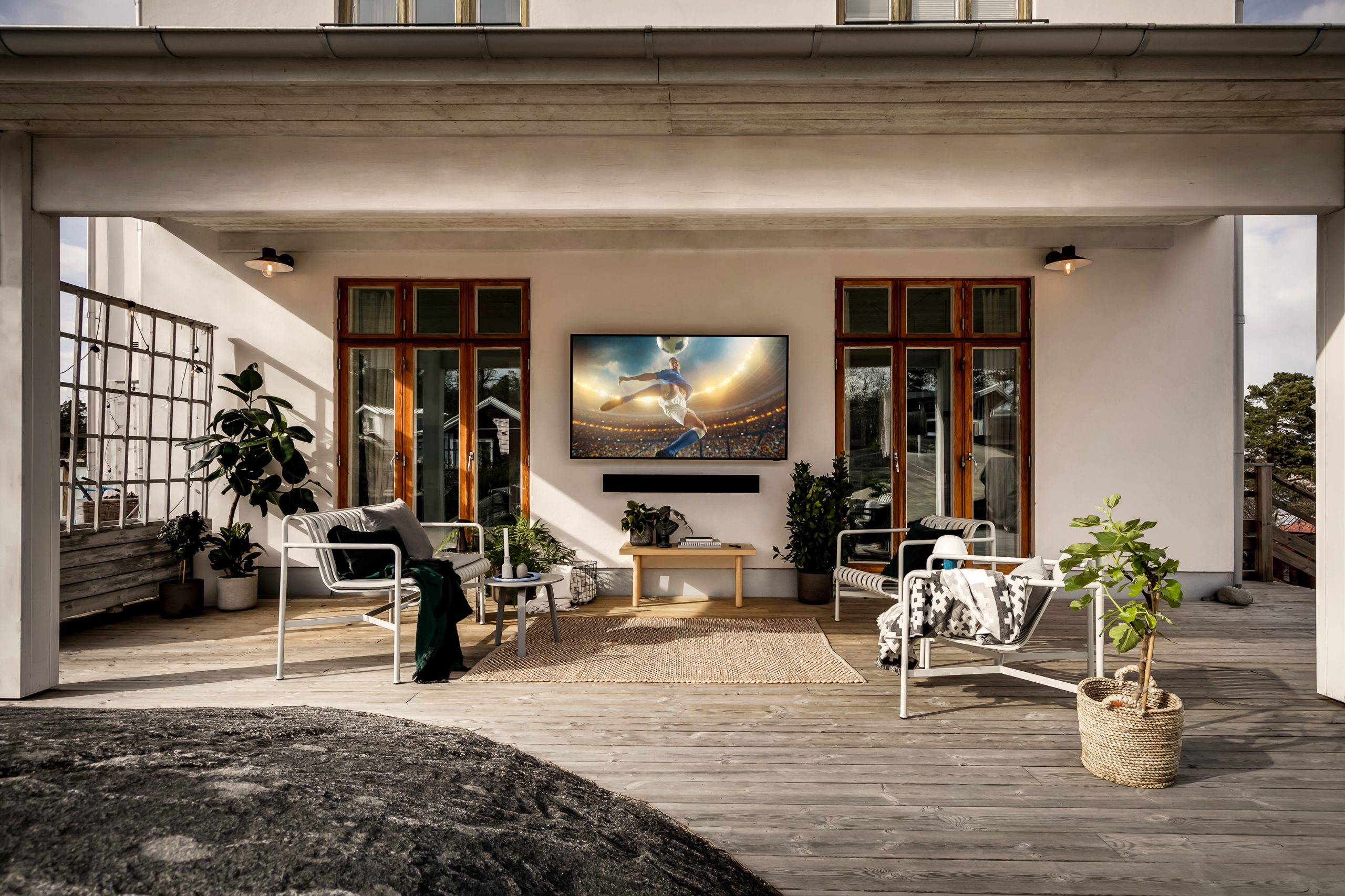Kohta pääsee nauttimaan television katselusta terassillakin: The Terrace on Samsungin ensimmäinen ulkokäyttöön sopiva televisiomalli. Se esiteltiin itse asiassa jo viime vuonna, mutta nyt se lanseerataan myös Pohjoismaissa. The Terrace on IP55-luokiteltu eli se kestää vettä ja pölyä. Näyttö 4K QLED, jonka kirkkaus on jopa 2 000 nitiä. Ruutu on käsitelty heijastamattomaksi, jotta kontrastit säilyisivät myös päivänvalossa.