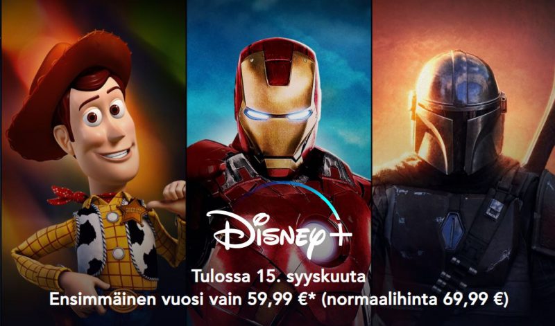 Suomessa Disney+ aukeaa 15.9., mutta palvelu on nyt ennakkotilattavissa. Disney tarjoaa ennakkotilaajan etuna palvelun ensimmäisen vuoden hintaan 59,90 €, eli kuukausihinnaksi muodostuu varsin edullinen 4,99 €. Normaaliksi vuosihinnaksi ilmoitetaan 69,90 € eli 5,80 € kuukaudessa.