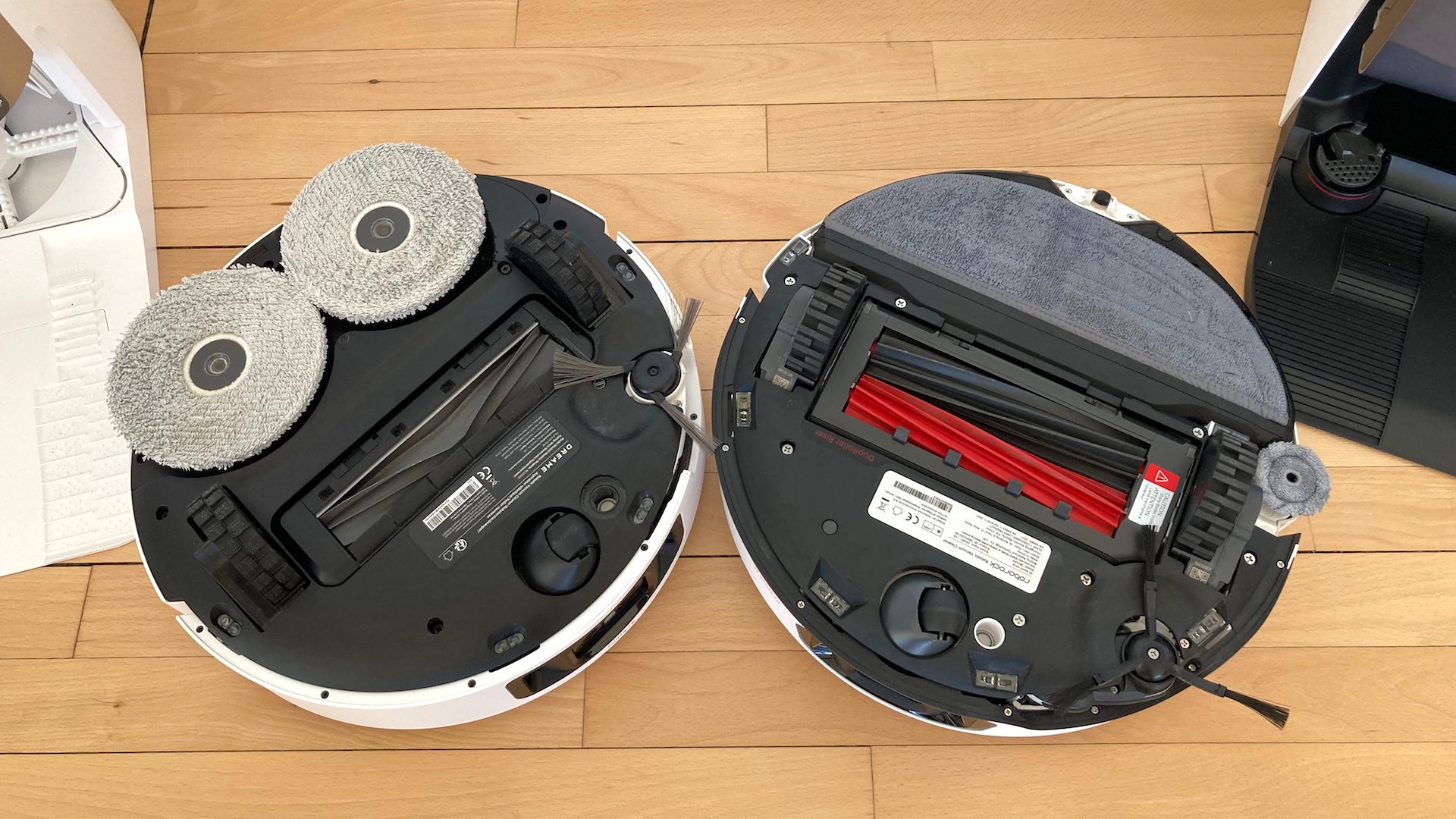 Roborock S8 MaxV Ultra on varustettu pienellä harjaspäällä, joka ylettää siivoamaan juuri oikeat paikat, kuten nurkat ja laatan reunukset. Dreame on laiskempi sivumoppiensa ja etuharjansa kanssa.