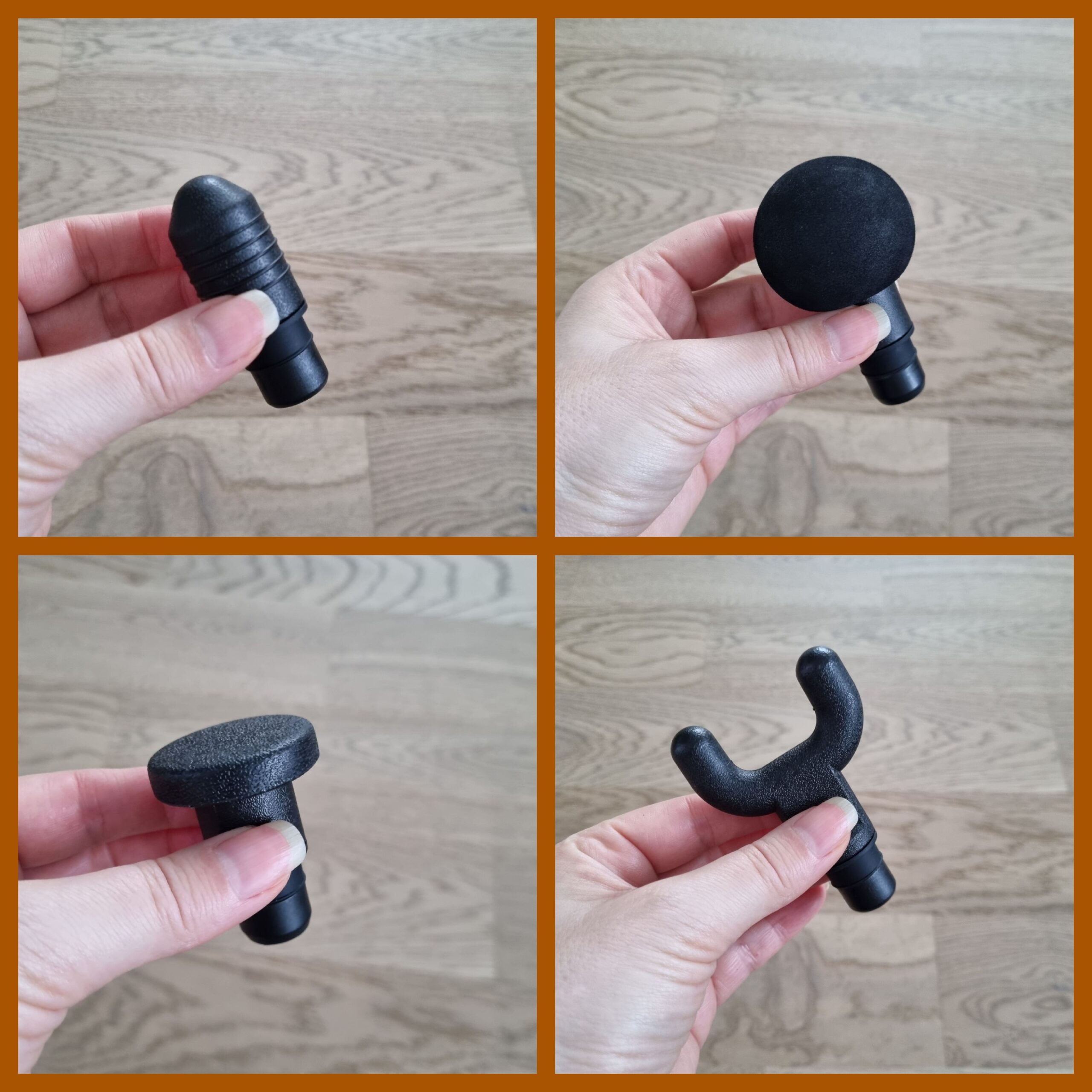 Paketissa on neljä erilaista hierontapäätä. Kolme niistä tuntuu muoviselta ja kovalta ja neljäs on selvästi pehmeämpi.
