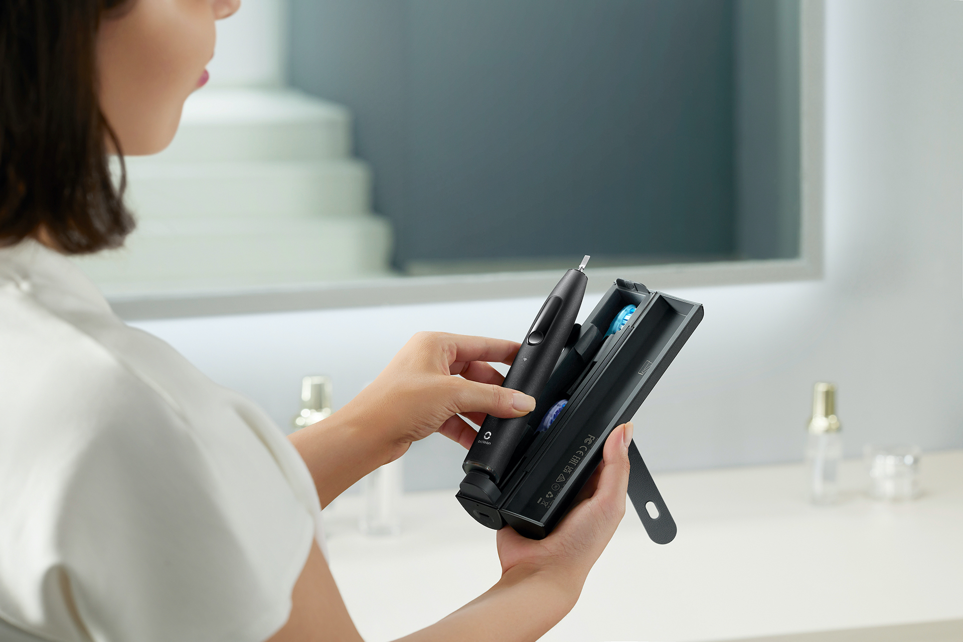 Oclean X Ultra S on saatavana kahdessa värissä, ja harjan sävyinen matkakotelo (tässä musta versio) ladataan USB-C-laturilla. Kuva: Oclean