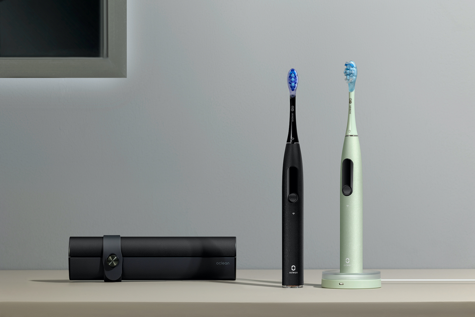 Ocleanin uusin huippumalli, X Ultra S, puhuu, välkkyy ja näyttää sovelluksessa, missä kohtaa hampaidenharjausta hukkaan aikaani. Sähköhammasharja on saatavilla mustana ja mattavihreänä. Latausasema ja USB-C-portin kautta ladattava matkakotelo tulevat samoissa sävyissä.