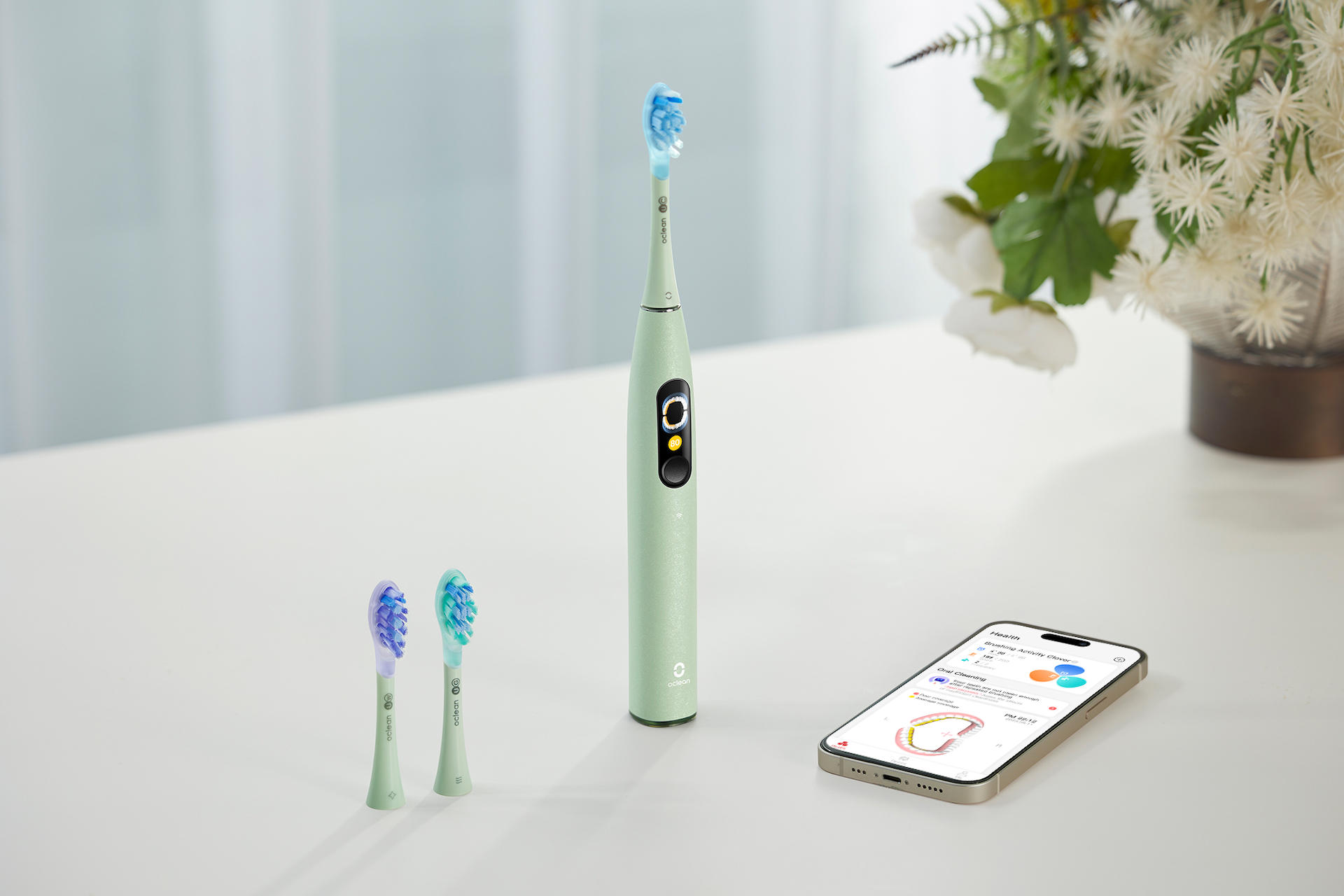 Oclean X Ultra S:n pakkaukseen kuuluu kolme erilaista harjaspäätä. Niiden käyttöä voi hienosäätää sovelluksesta. Kuva: Oclean