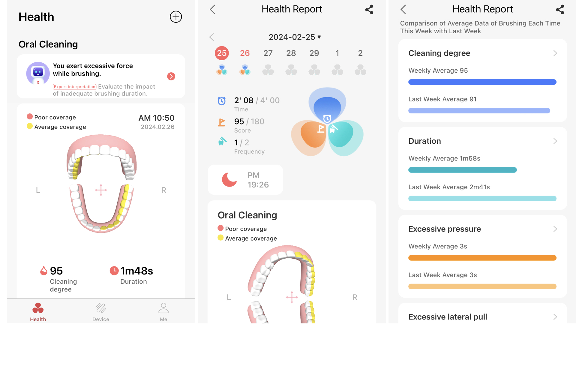 Mittaustulokset katoavat, kun harjaa käyttää seuraavan kerran. Jos haluaa enemmän tietoa, on katsottava sovelluksesta. Sovelluksesta näkee, kauanko hampaita on harjannut ja jäikö jokin heikommalle huomiolle. Myös sovelluksesta näkee apilan muotoisen tiivistelmän.