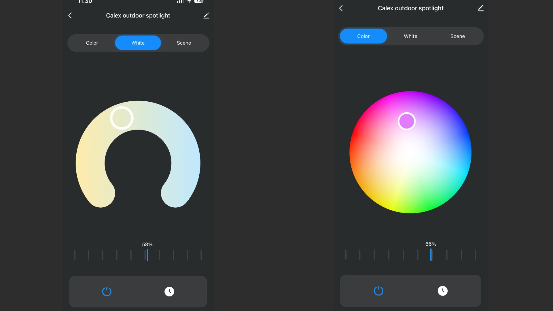 Esimerkki luovuudesta on Calexin sovelluksen liukuvalinta, jolla valitaan valkoisen valon värilämpötila. Fiksua. Tietysti sovelluksessa on myös samanlainen RGB-väriympyrä kuin muillakin.