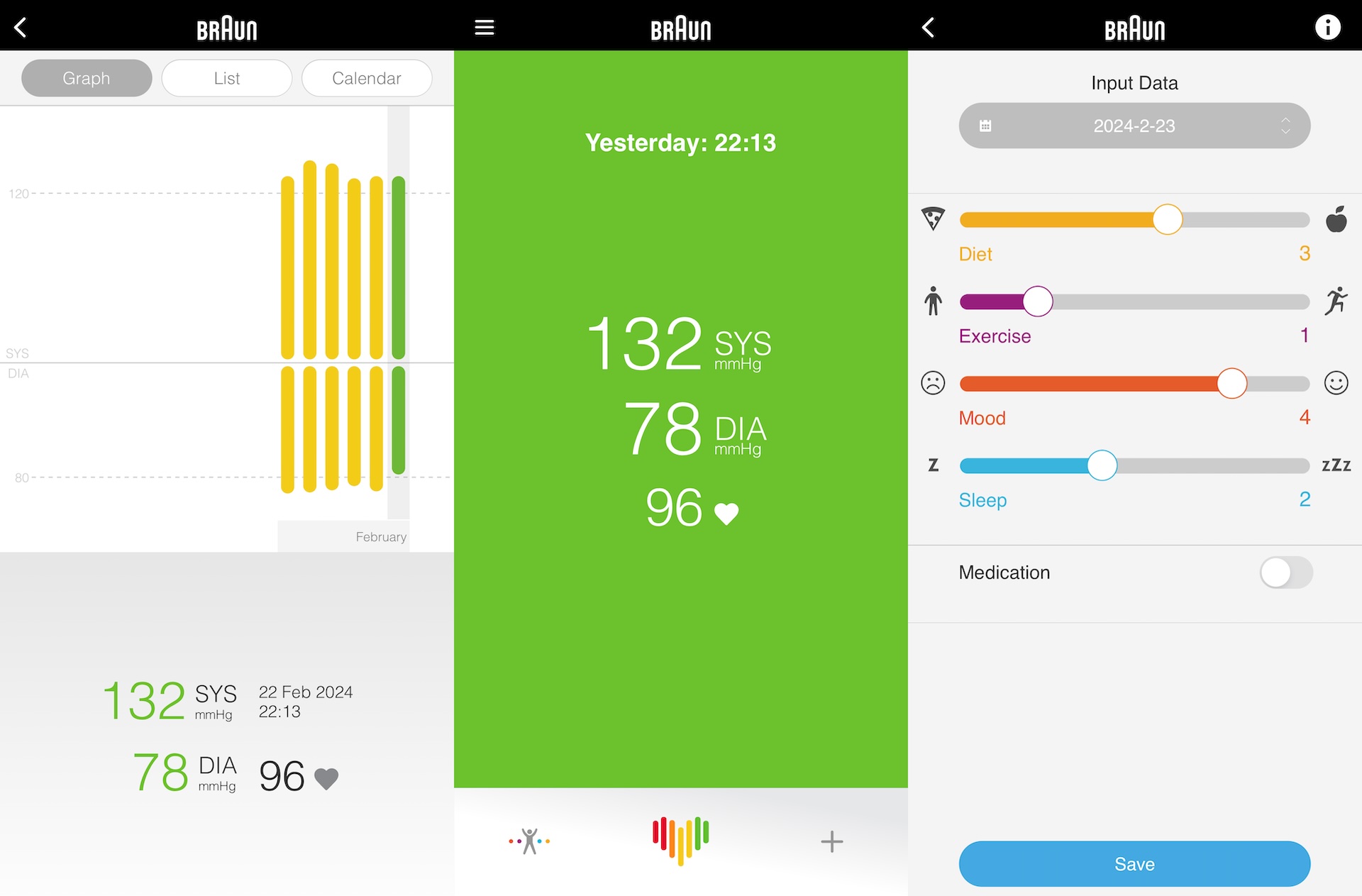 Sovelluksen aloitusnäkymä on aina sen värinen kuin viimeisin mittaustuloskin ja tulos näkyy toki myös numeroin. Mittaushistoriaa voi tarkastella käyränä, listana tai värikoodattuna kalenterina. Jos haluaa pysyä paremmin kärryillä siitä, mikä tulokseen on voinut vaikuttaa, voi sovellukseen arvioida syömisensä, liikkumisensa, mielialansa ja nukkumisensa viisiportaisen asteikon avulla. Sovellukseen saa lisättyä myös muistutuksia ja manuaalisia mittaustuloksia. Mittaustulokset voi myös lähettää sovelluksesta sähköpostitse lääkärilleen.