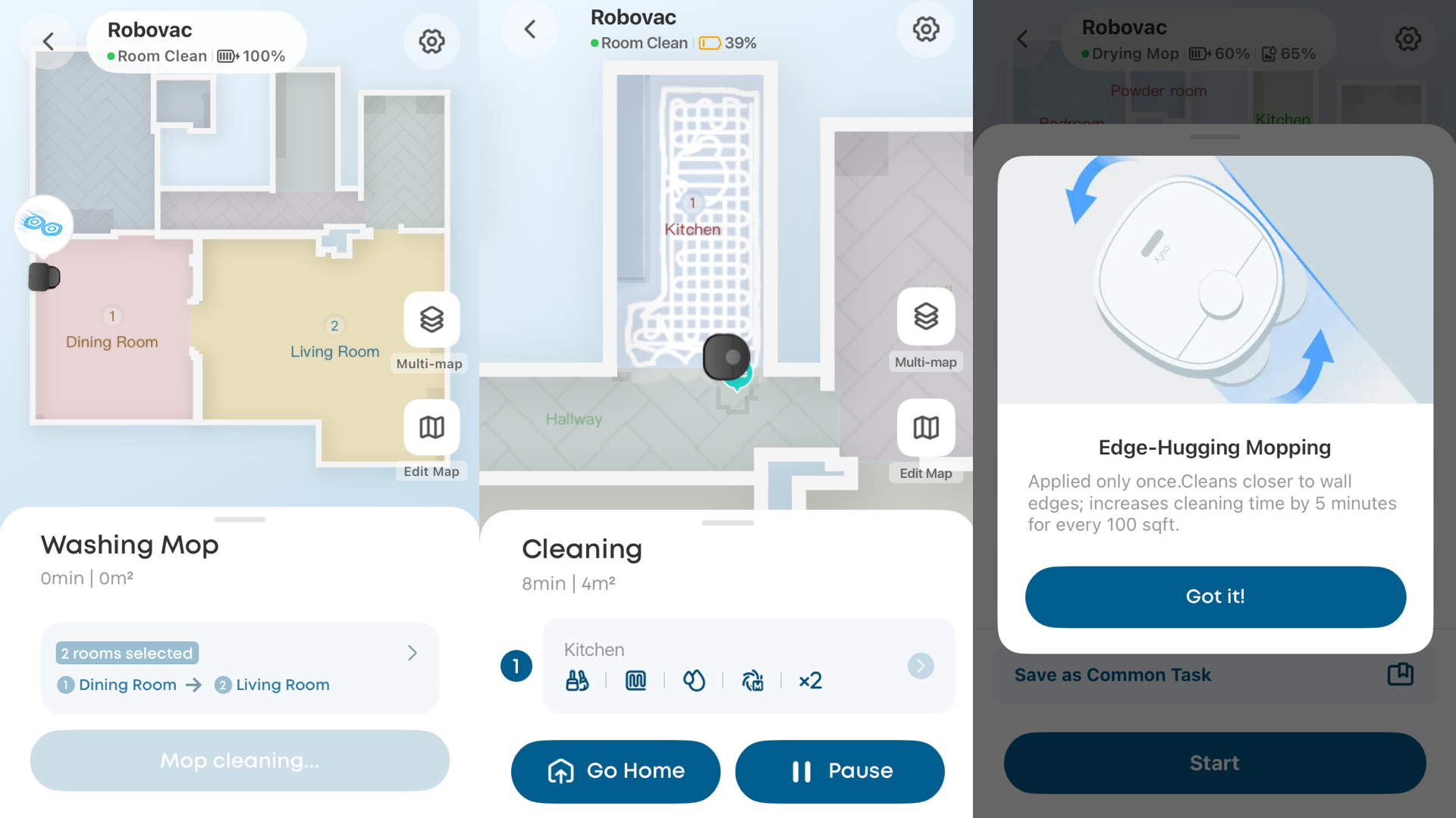 Kartoitus sujuu helposti ja sovelluksen käyttöliittymä on yksinkertainen ja looginen. Eufyn robotti on testin ainoa, jossa on erikseen päälle laitettava reunustojen siivoustoiminto. Kuvakaappaus