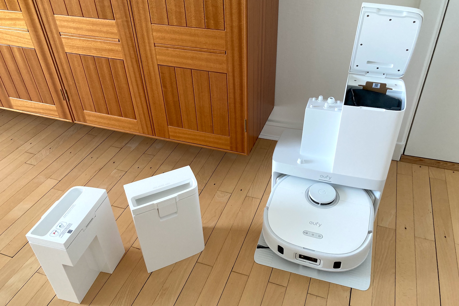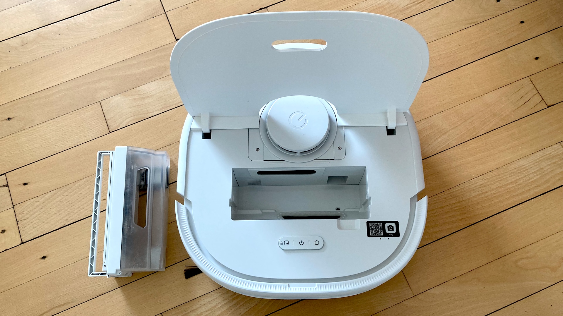Eufyn mukaan latausaseman puhtaan veden säiliöstä riittää kahteen tai kolmeen pesukertaan 150–200-neliöisessä kodissa. Todellisuudessa robotin pitää täyttää säiliötään 25 neliön lattianpesun jälkeen perusasetuksella, joten jouduin täyttämään säiliön kolme kertaa testijakson aikana.
