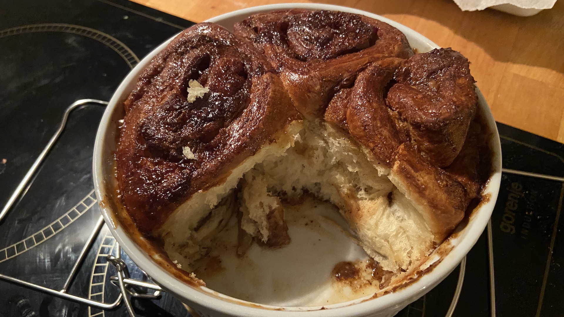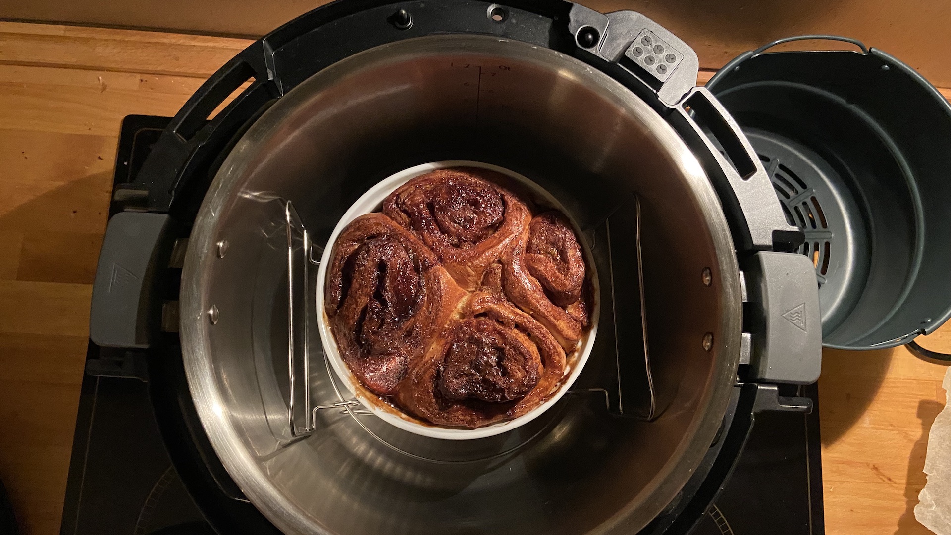 Jälkiruuaksi päätin tehdä korvapuusteja, sillä testasin samalla myös monitoimikonetta. Instant Potiin mahtui neljä isoa pullaa. Ero tavallisessa uunissa ja Instant Potissa paistettujen puustien välillä oli huomattava: Instant Potilla pulliin tuli paremmin karamellisoitu pinta – ehkäpä siksi, että puustit pääsevät siinä paistumaan lähempänä lämmitysvastusta. Joka tapuaksessa Instant Potilla tehdyt pullat olivat mielestämme parempia kuin uunissa tehdyt, mikä todistaa Instant Potin olevan paitsi käytännöllinen, myös lopputuloksen kannalta parempi. Kovin suuria leipomuksia ei Instant Potiin tosin kerralla mahdu.