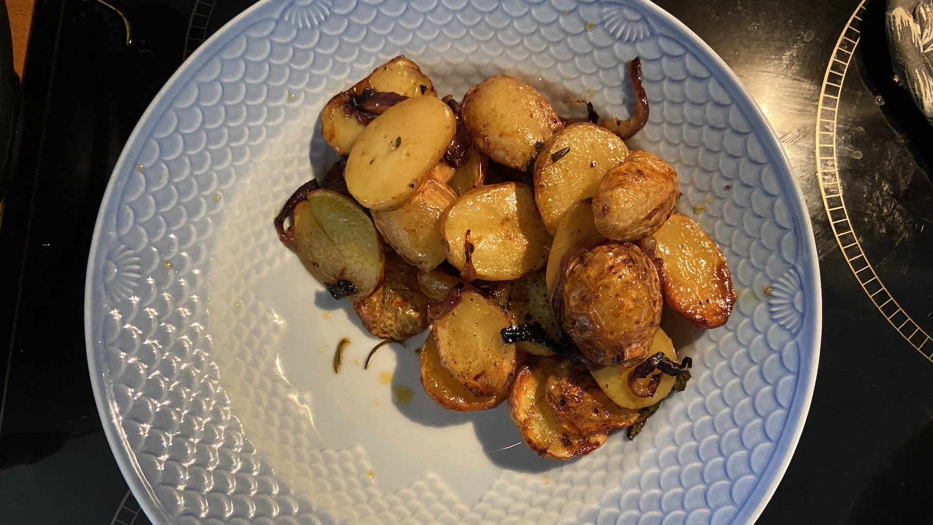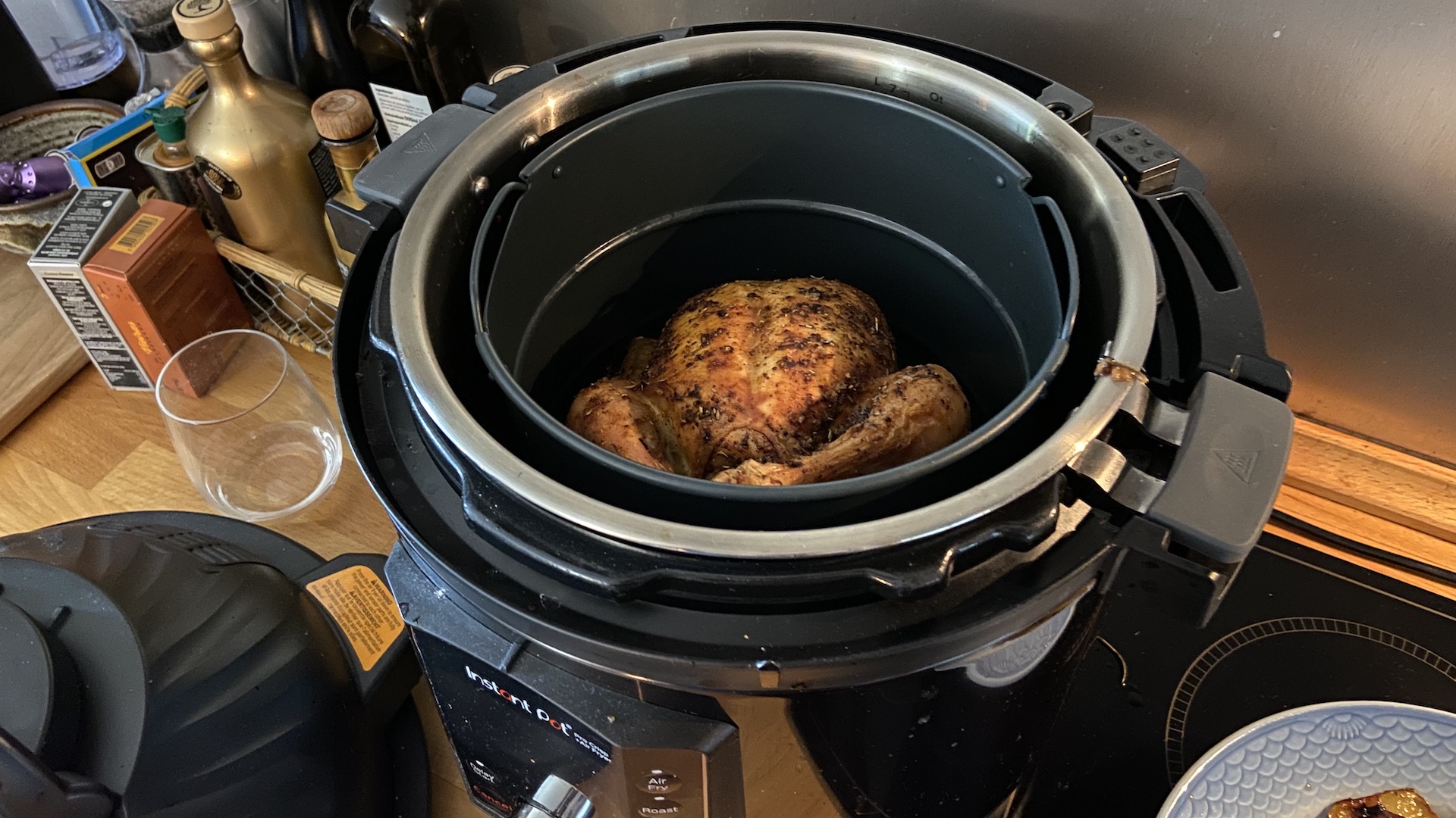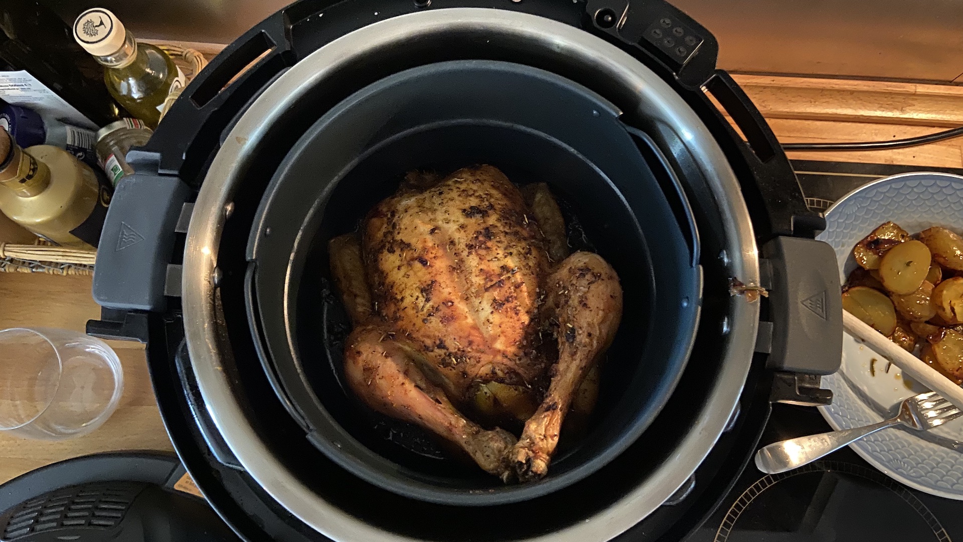 Ei ole väliä, valitseeko Instant Potista uuni- vai airfryer-toiminnon, sillä se vaihtaa vain ehdotettua asetusta. Asetus kannattaa valita kuten kiertoilmauunissakin. Ilma kiersikin kanaa täydellisesti, sillä nahka oli kauttaaltaan mukavan rapea, ja pohjalla olevista perunoista tuli juuri sellaisia kuin haaveilinkin: kullanruskeita ja kananrasvasta aromia imeneitä herkkupalleroita. Metallilieriössä kana oli helppo nostaa ylös. Nostettuani perunat pohjalta paistoin ylijääneessä kananrasvassa vielä pari padronpaprikaa ja lopuksi keittelin vielä nopean kastikkeen pohjalle jääneistä herkuista. Tämän helpompaa, halvempaa ja herkullisempaa ateriaa saa hakea!
