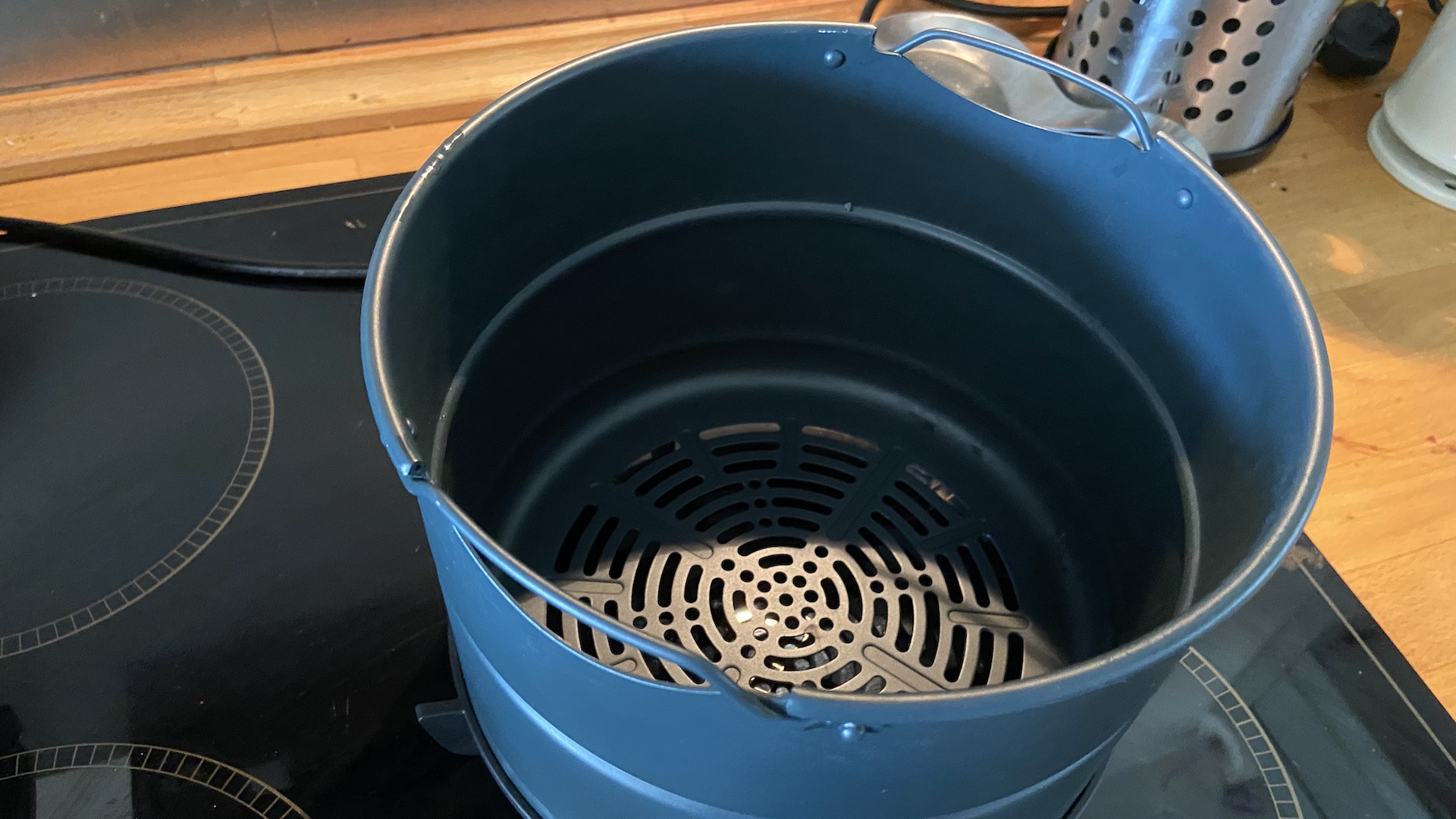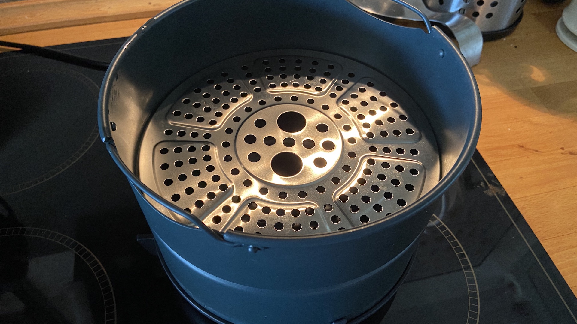 Instant Potin jokaisella neliösentillä on tarkoituksensa, ja sama pätee varusteisiin. Pakkauksen mukana toimitetaan kaksi varustetta. Kuulostaa ehkä pihiltä, mutta niiden avulla pääsee jo pitkälle. Toinen on kori ja toinen pieni metallinen jalusta. Molemmat on tarkoitettu kattilan pohjalle, ja halutessaan ne voi asettaa hieman irti kuumasta pohjasta. Korissa on lisäksi irrotettava ritilä, jonka ansiosta ruokaa voi kypsentää useammassa tasossa. Varsin elegantti ja yksinkertainen ratkaisu, josta on hyötyä niin kuivatuksessa kuin ilmafriteerauksessa. Metallijalustassa on korkeat kädensijat, joiden avulla leipomukset saa helposti nostettua kattilasta.