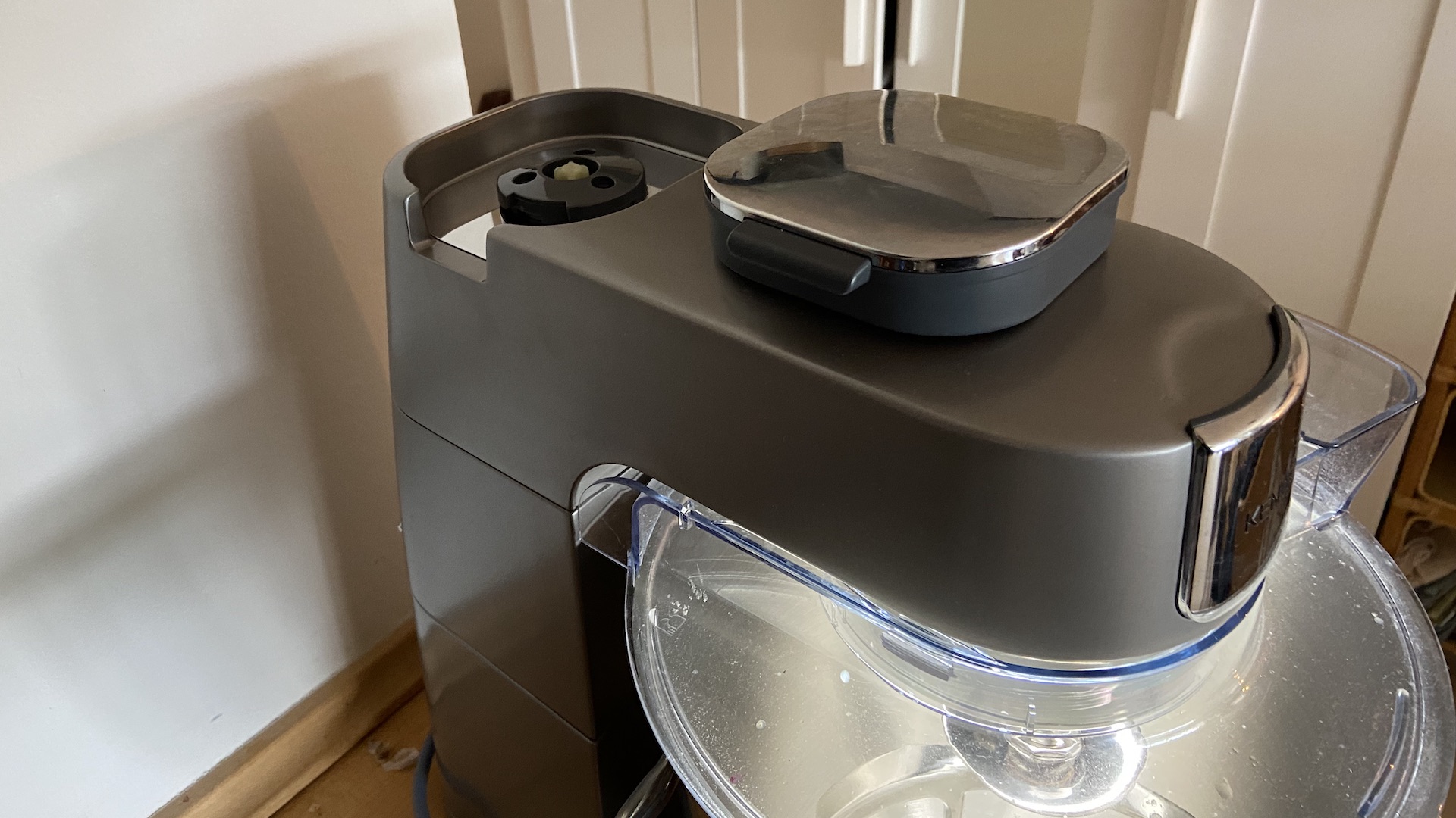 Säätöpyörä toimii hyvin, joten laitteen käyttö ja asetusten vaihto sujuu mukavasti. Näyttöä lukuun ottamatta tämä yleiskone sopii useimmille ja tuntuu tutulta. Yläosa nousee, jolloin kulhon saa paikoilleen tai pois. Lisälaitteiden kytkentäpaikkoja suojaavat magneettiset luukut.