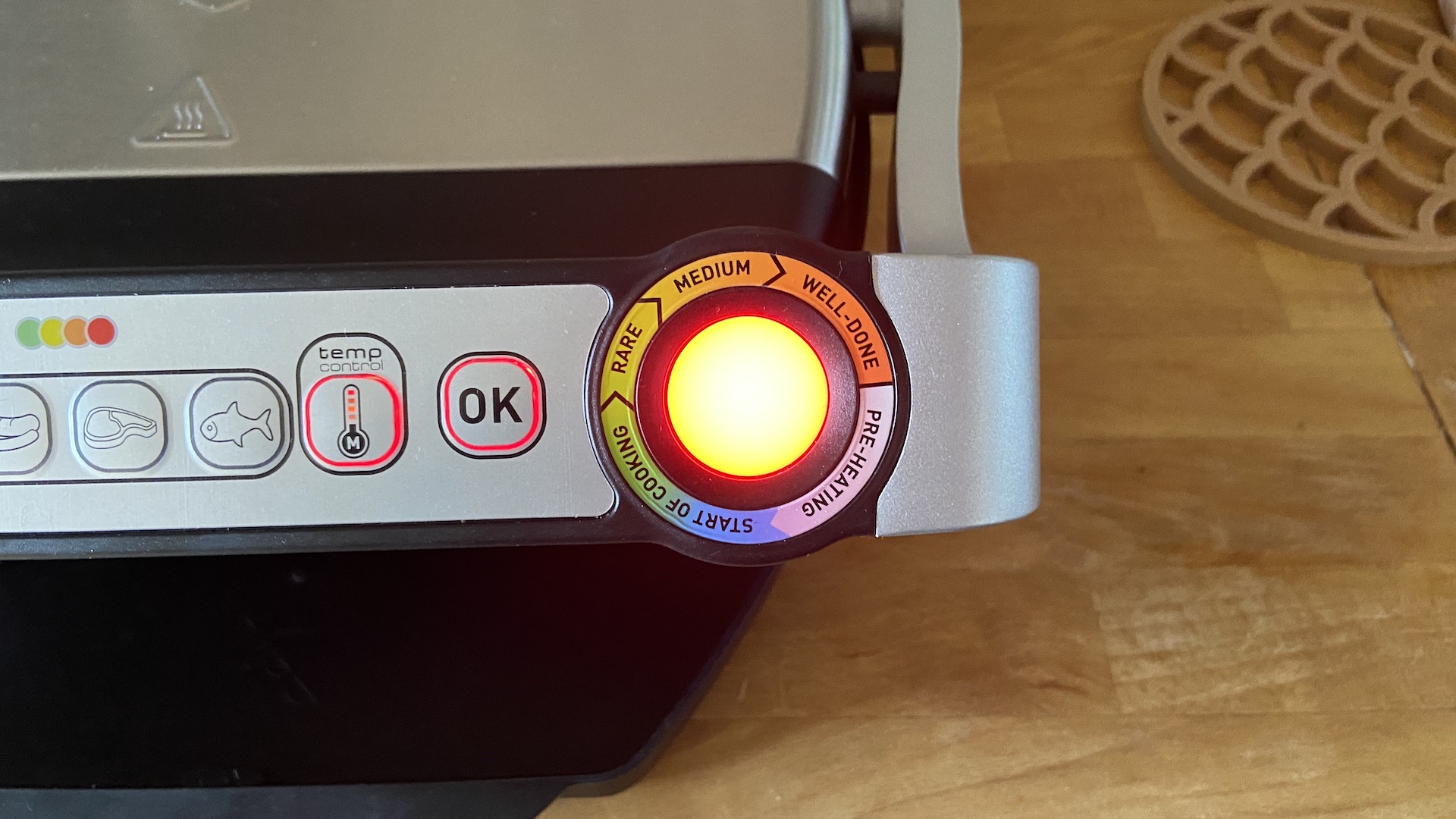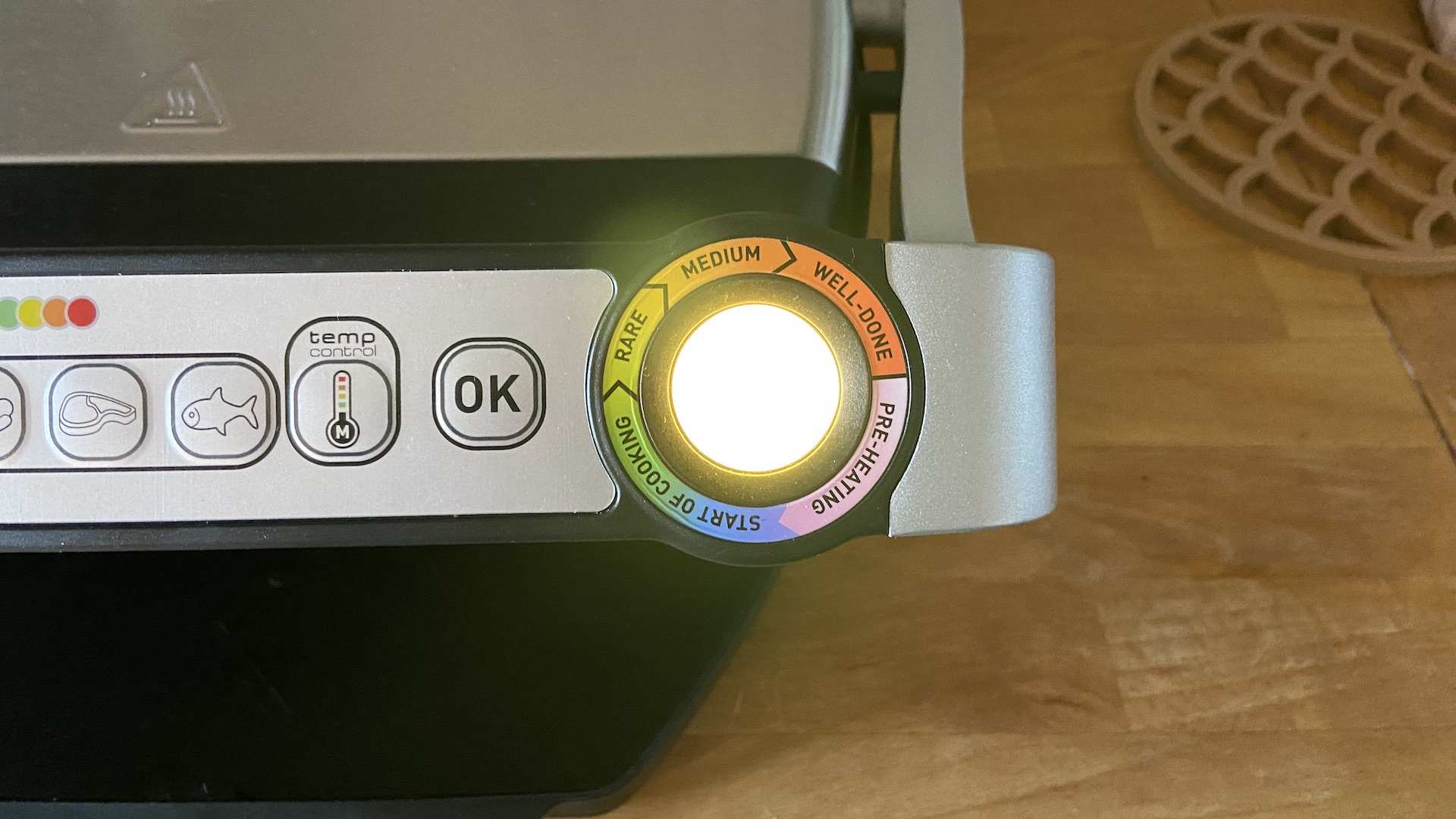 Optigrill+:n etupuolen jättivalo herättää aluksi hämmästystä. Valo vaihtaa väriä lämpötilan tai valitun ohjelman etenemisen mukaan. Käyttöohjetta tavaamalla selviää, mikä väri, ääni ja nappula tarkoittaa mitäkin.