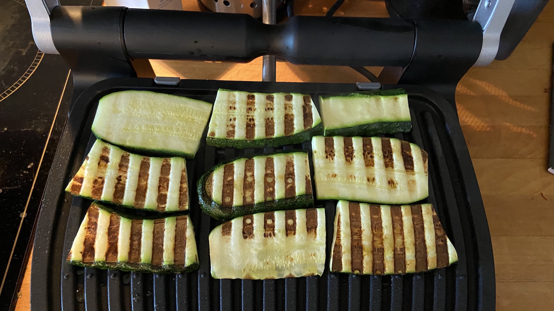 Kasviksille ei ole tarjolla automaattiohjelmaa, joten jos aikoo kypsentää koko aterian grillissä, on joka tapauksessa opeteltava käyttämään laitetta manuaalisesti. Onneksi manuaalitoiminnolla grilli toimii hyvin, etenkin kasvisten suhteen. Kesäkurpitsa- ja munakoisosiivut paistuivat tasaisesti ja nopeasti molemmilta puolilta.