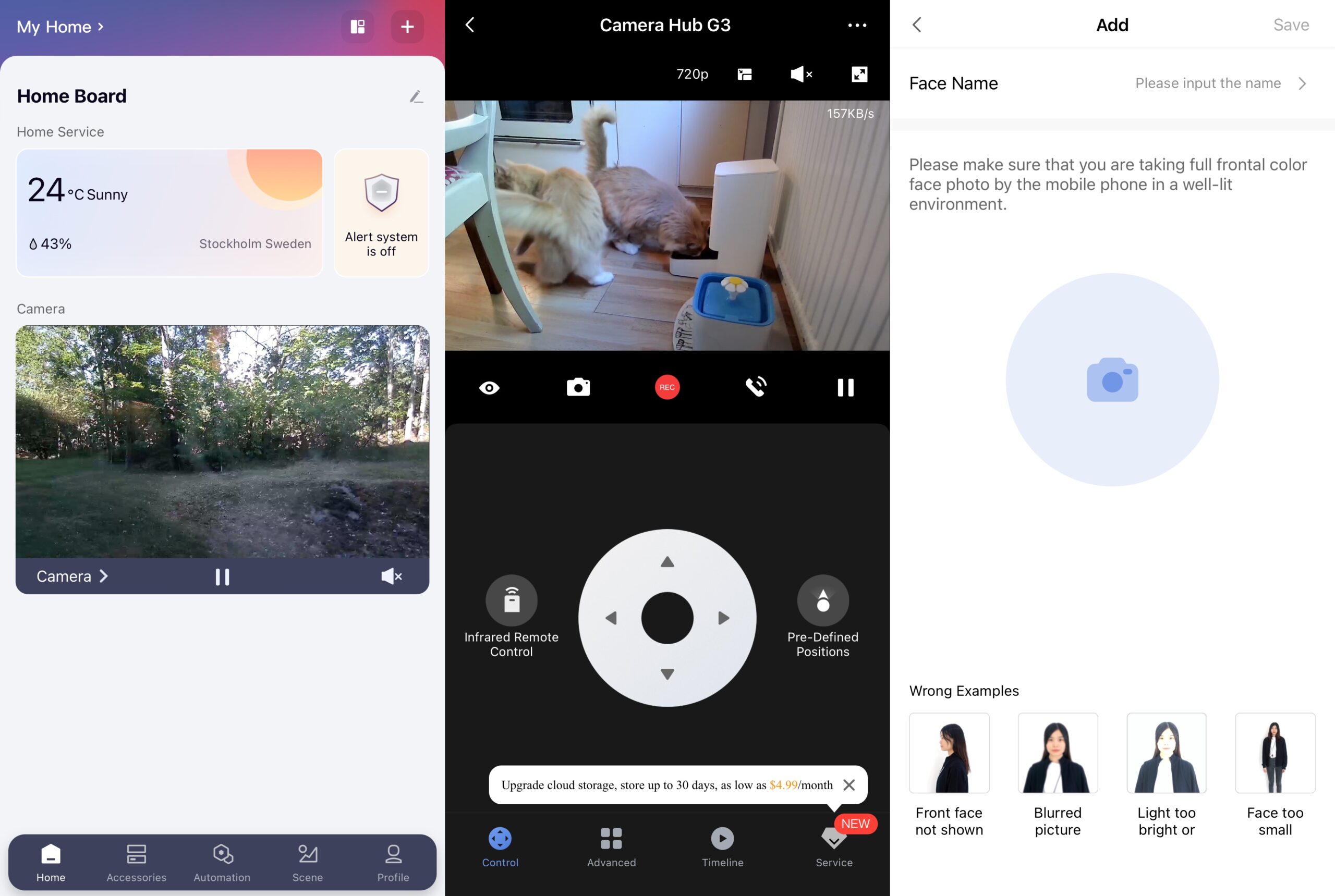 Aqaran kamera on eittämättä testin älykkäin kasvontunnistuksineen, mutta ei vain siksi. Moottorin ansiosta laite osaa nimittäin seurata ihmistä tai lemmikkiä tilassa pitäen kohteen aina kuvassa. Ainakin vaakasuunnassa, sillä valitettavasti kamera ei kallistu kovin paljon alaspäin. Kamera voi myös kuvata panoraamaa havaitakseen liikettä, ja sen voi asettaa reagoimaan koviin ääniin, kuten rikkoutuneeseen ikkunaan. Siihen voi ohjelmoida aika monimutkaisiakin automaatioita.