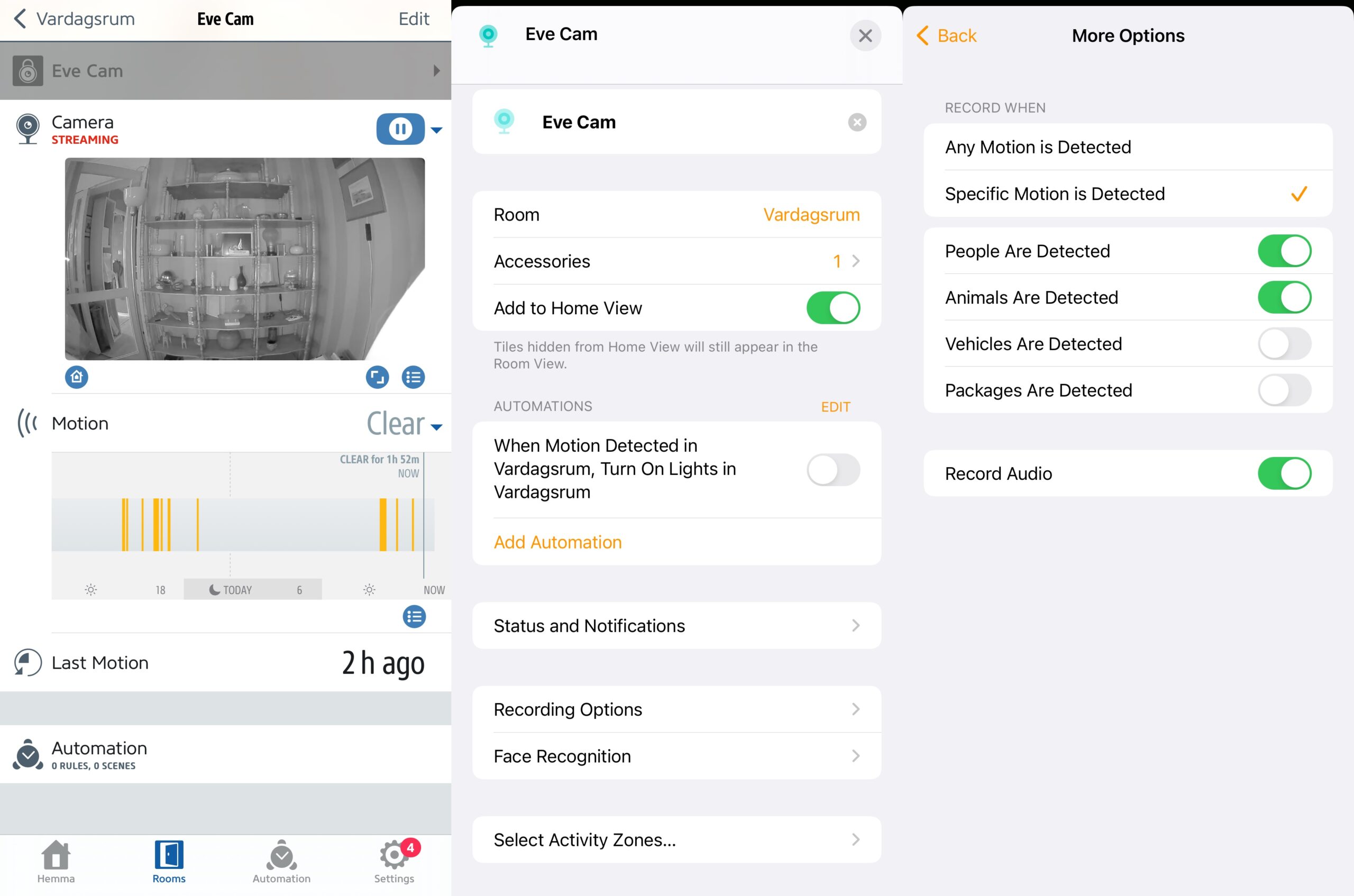 Tarjolla on Eve-sovellus, jolla ei kameran kannalta tee juuri mitään. Se näyttää kylläkin kaikki kodin yhteensopivat älylaitteet yllättävän selkeällä ja informatiivisella tavalla. Kaikki hallinta tapahtuu kuitenkin Applen Koti-sovelluksella.