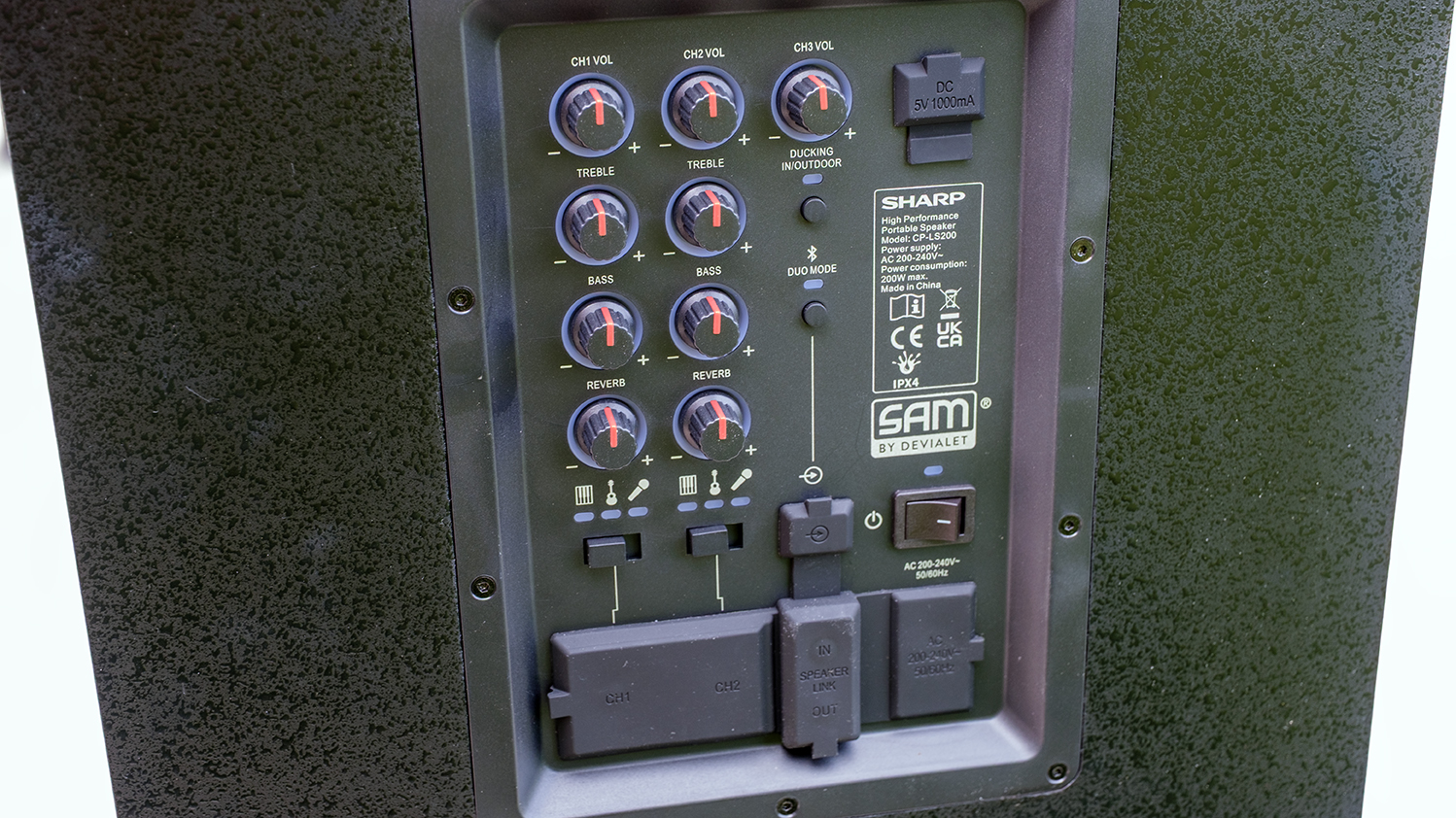 Eikä PA-kaiuttimen ulkonäkö edes ole hämäystä, sillä kaiuttimen takana on Pro Panel, jossa on kolme sisääntuloa plugeille tai XLR-liittimille eli kitaroille ja mikrofoneille sekä säätimet kaiulle, bassolle ja diskantille, joten kaiutin toimii pienenä PA-laitteena.