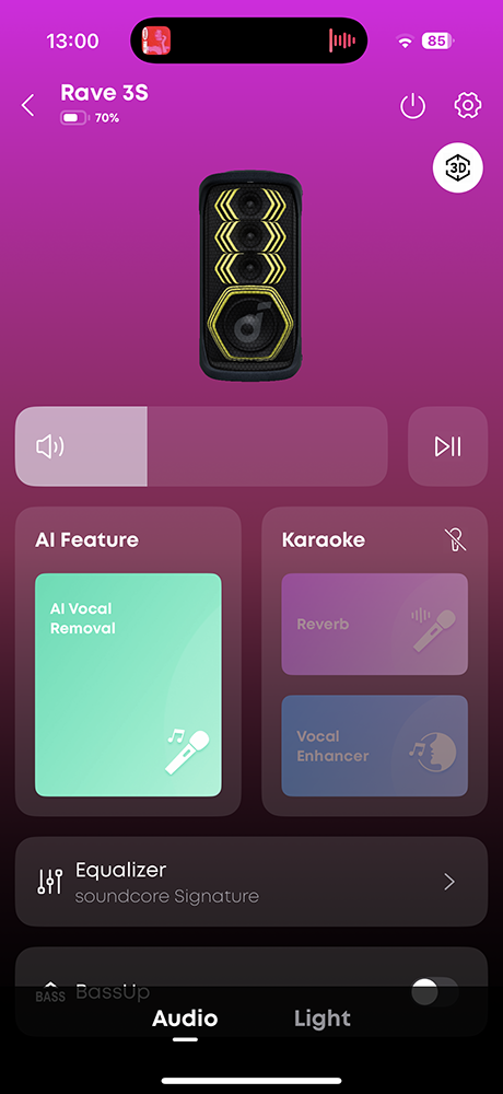 Soundcore Rave 3S -kaiutinta voi ohjata Soundcore-sovelluksella. Sovelluksessa on taajuuskorjain, jolla ääntä saa muokattua omaan makuun sopivaksi. BassUp 2.0 -toiminnolla bassontoistoa saa entistäkin lujemmalle.