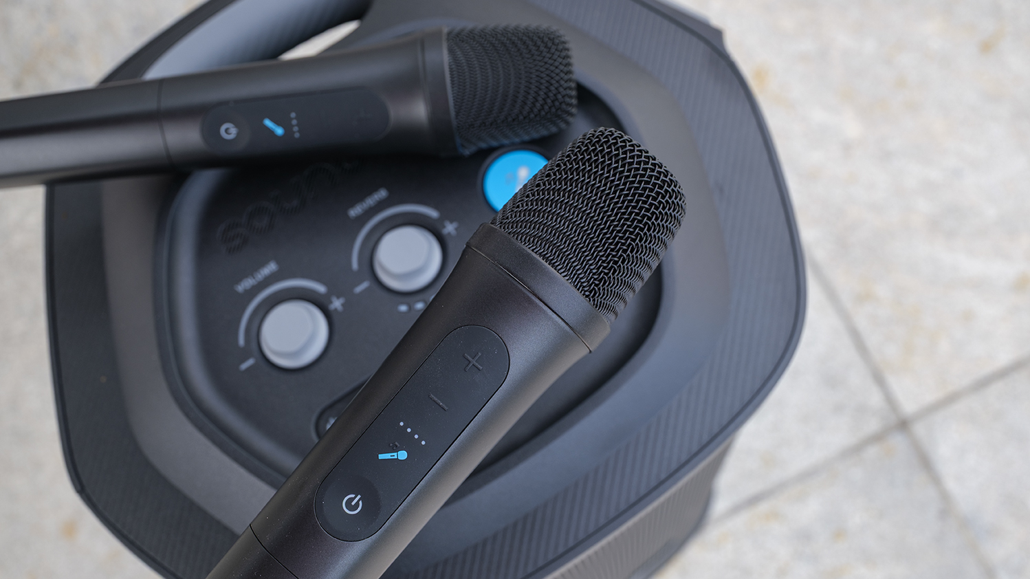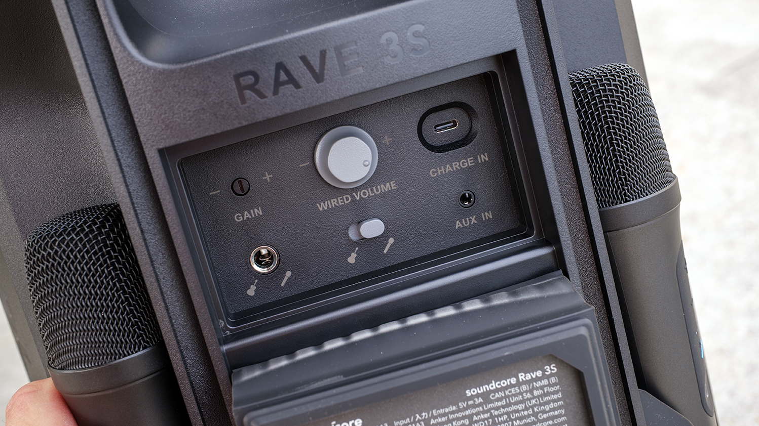 Rave 3S on testin ainoa kaiutin, jonka mukana toimitetaan langattomat mikrofonit. Kahdelle mikille on kiinnityspaikat kaiuttimen takapuolella, joten ne kulkevat kätevästi aina mukana. Kaiuttimessa on näppärä AI Vocal Removal -toiminto, joka vaimentaa soitettavan kappaleen lauluosuudet, jotta karaokebileissä voi vetää omia tulkintojaan.