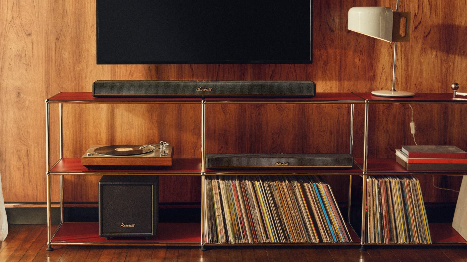 Marshall Heston 60 (keskellä) on huomattavasti pienempi kuin Heston 120. Tässä soundbar on yhdessä Heston Sub 200 -subwooferin kanssa. Kuva: Marshall