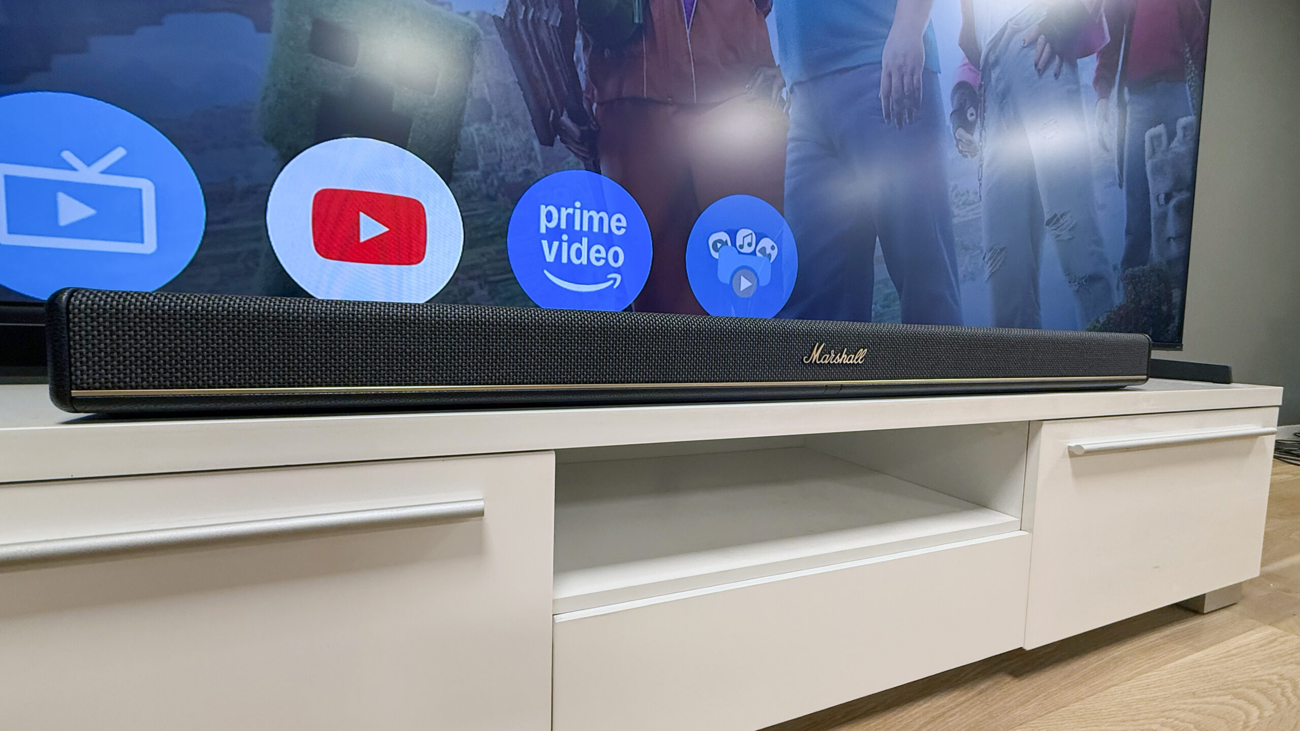 Liitäntävalikoima on hyvä: HDMI eARC:n lisäksi on ”HDMI pass-through”-sisääntulo 4K/120 Hz:n tuella. Myös analoginen RCA-levysoitinliitäntä löytyy, samoin kuin USB-C. Käyttöönotto sujuu helposti Marshallin sovelluksella, joka toimii myös kaiuttimen kaukosäätimenä.
